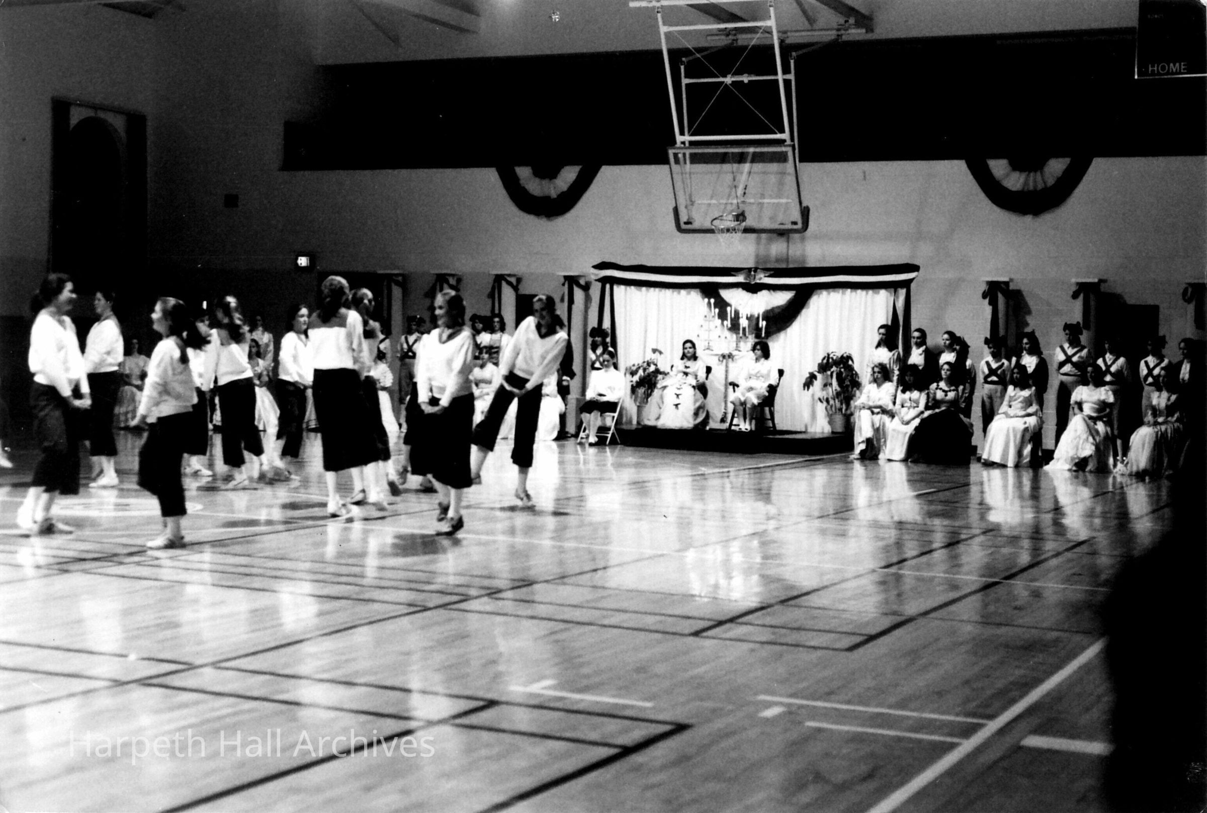 A group of seventh grade students performing as sailors in the George Washington Day Celebration. The photo is taken in the Morrison Gym in the McMurry Center.Context