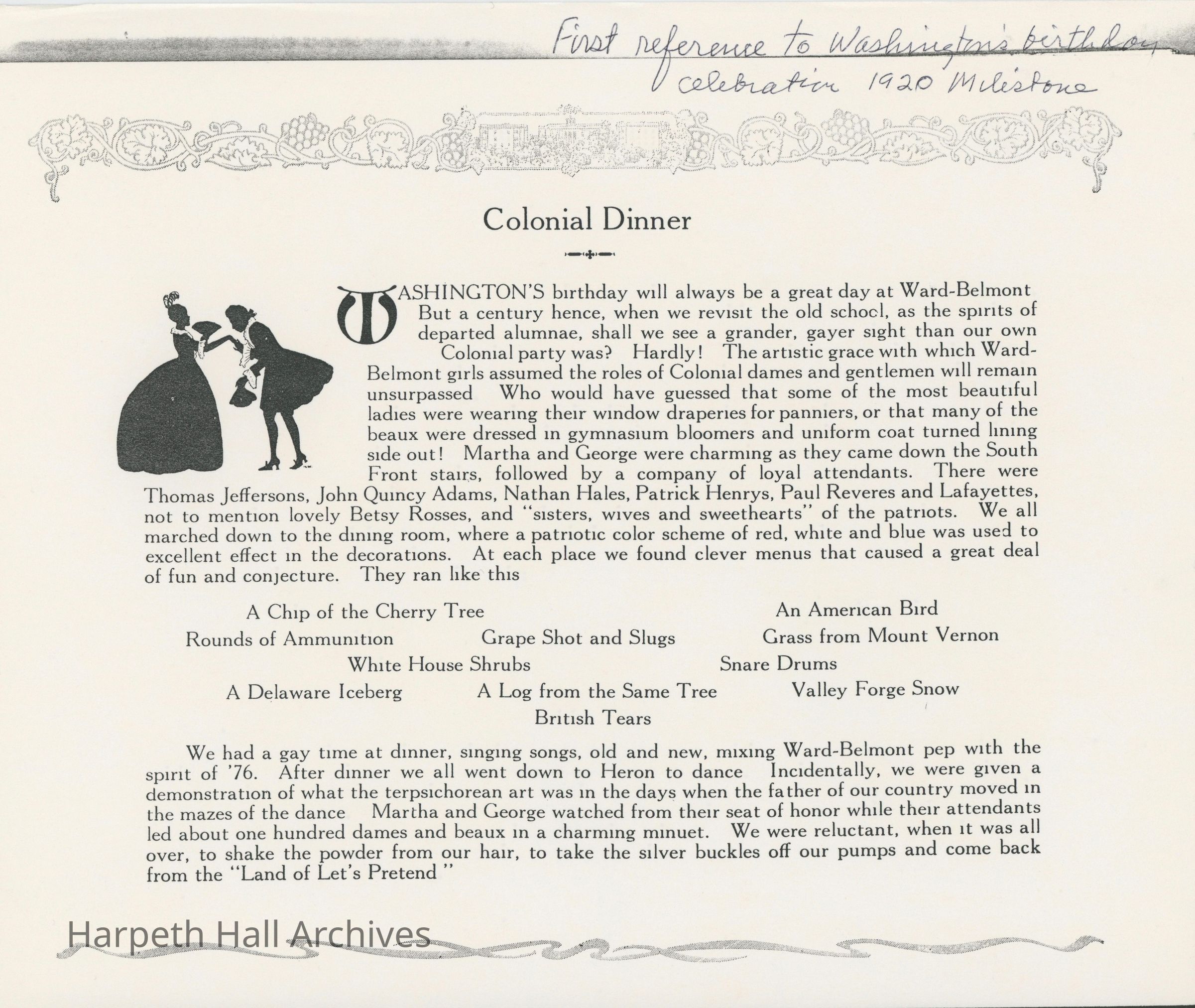The George Washington Day Celebration was a tradition that began at Belmont College for Young Women, developed into a costume ball and dance at Ward-Belmont, and was transferred to Harpeth Hall, where it continued as a special all-school program performed by Middle School students until 2020.Collection