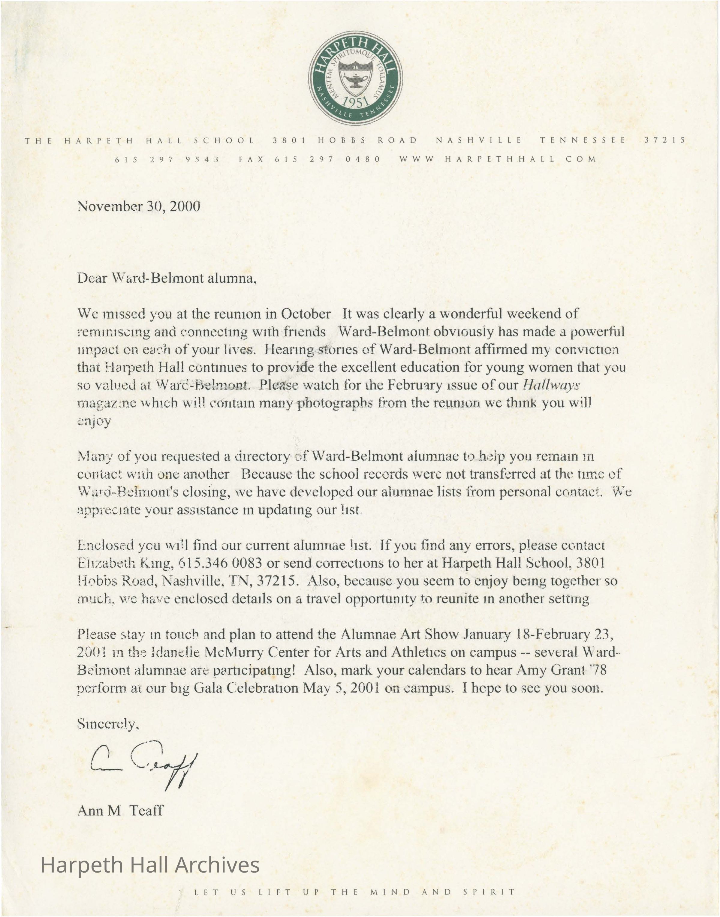 Letter from Ann Teaff to Ward-Belmont Alumna who were unable to attend the Ward Belmont Celebration in October of 2000Relationships