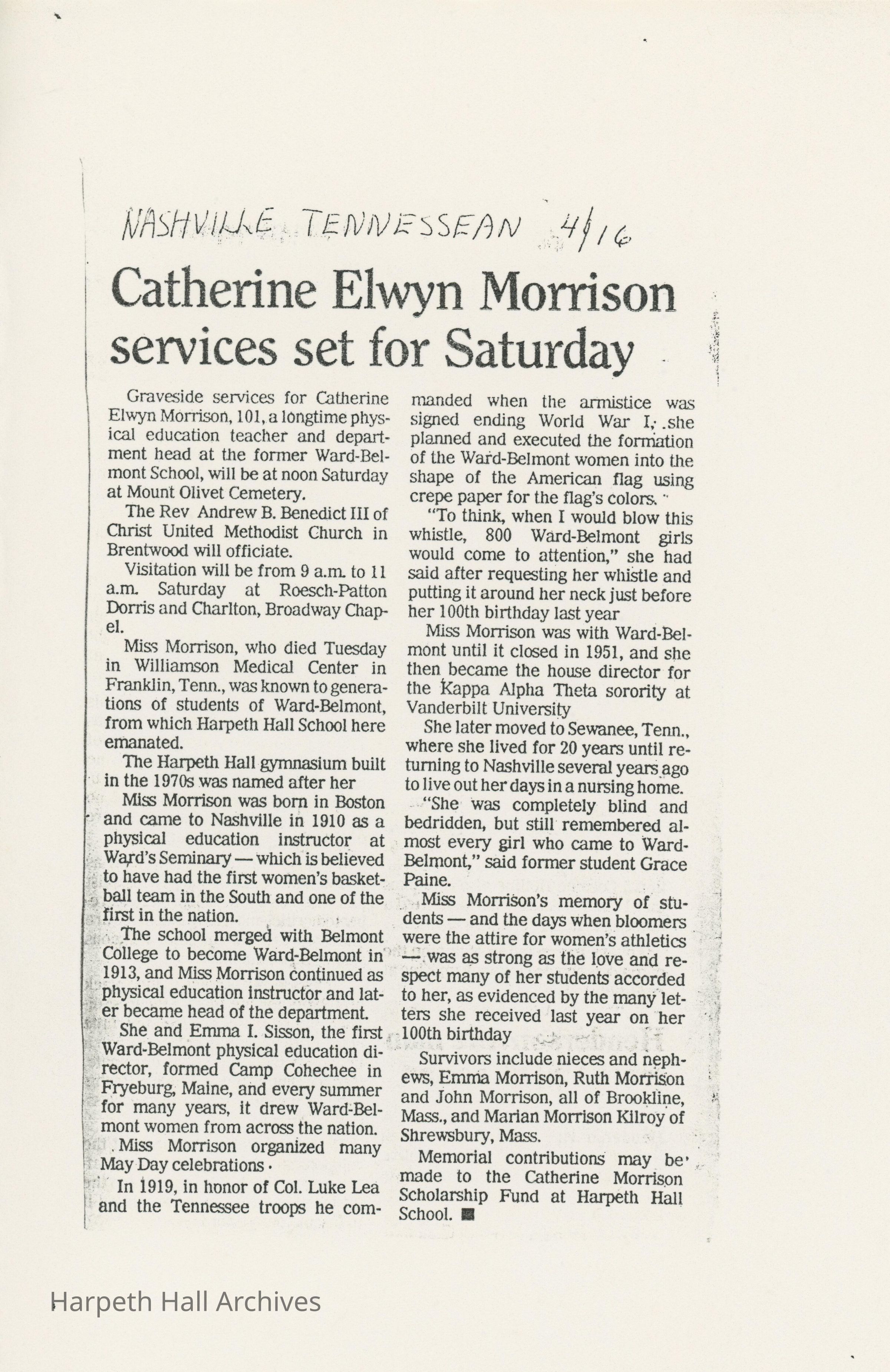 An article written in the Nashville Tennessean on April 16th in regards to the service for Catherine Morrison's funeral.Context