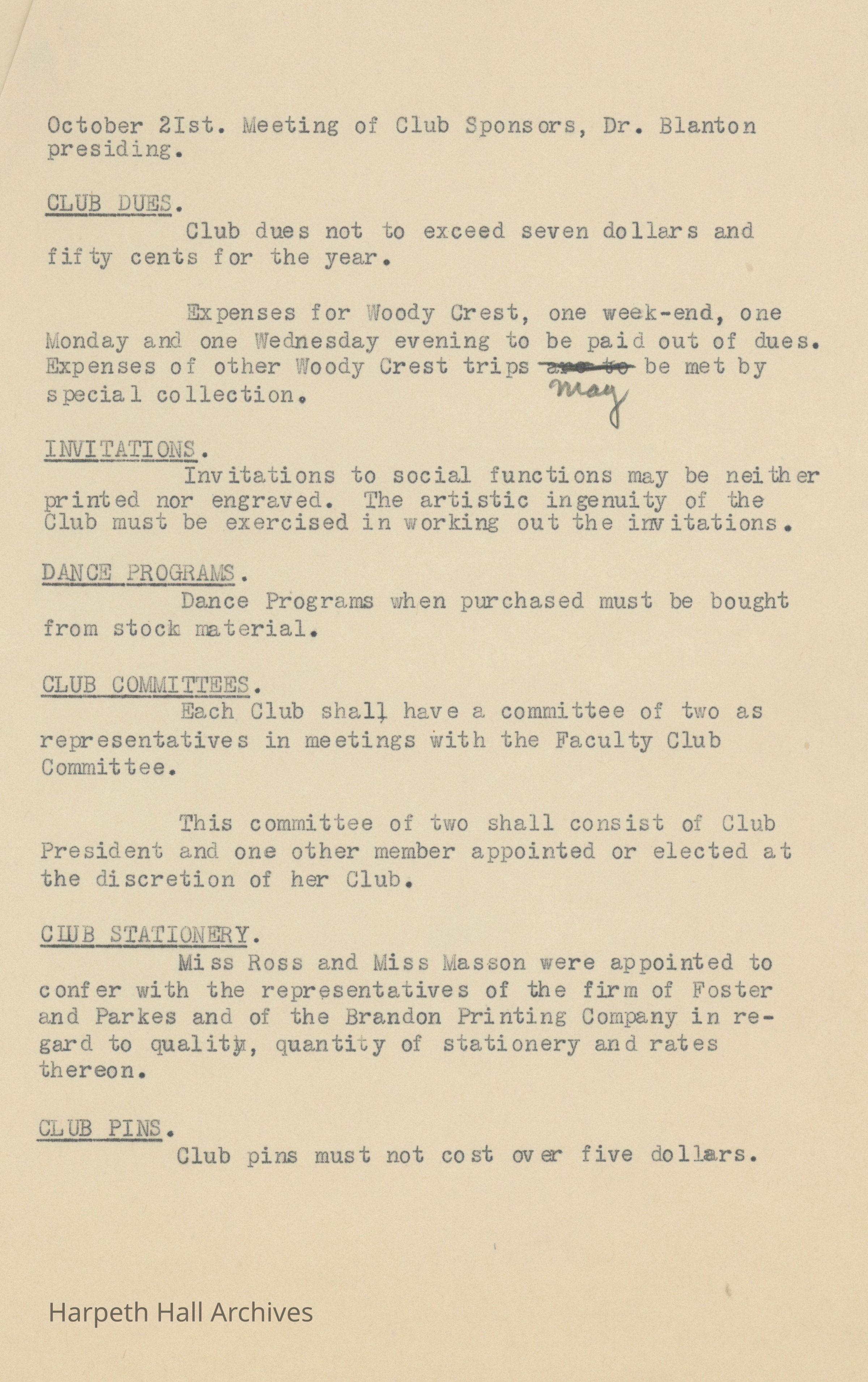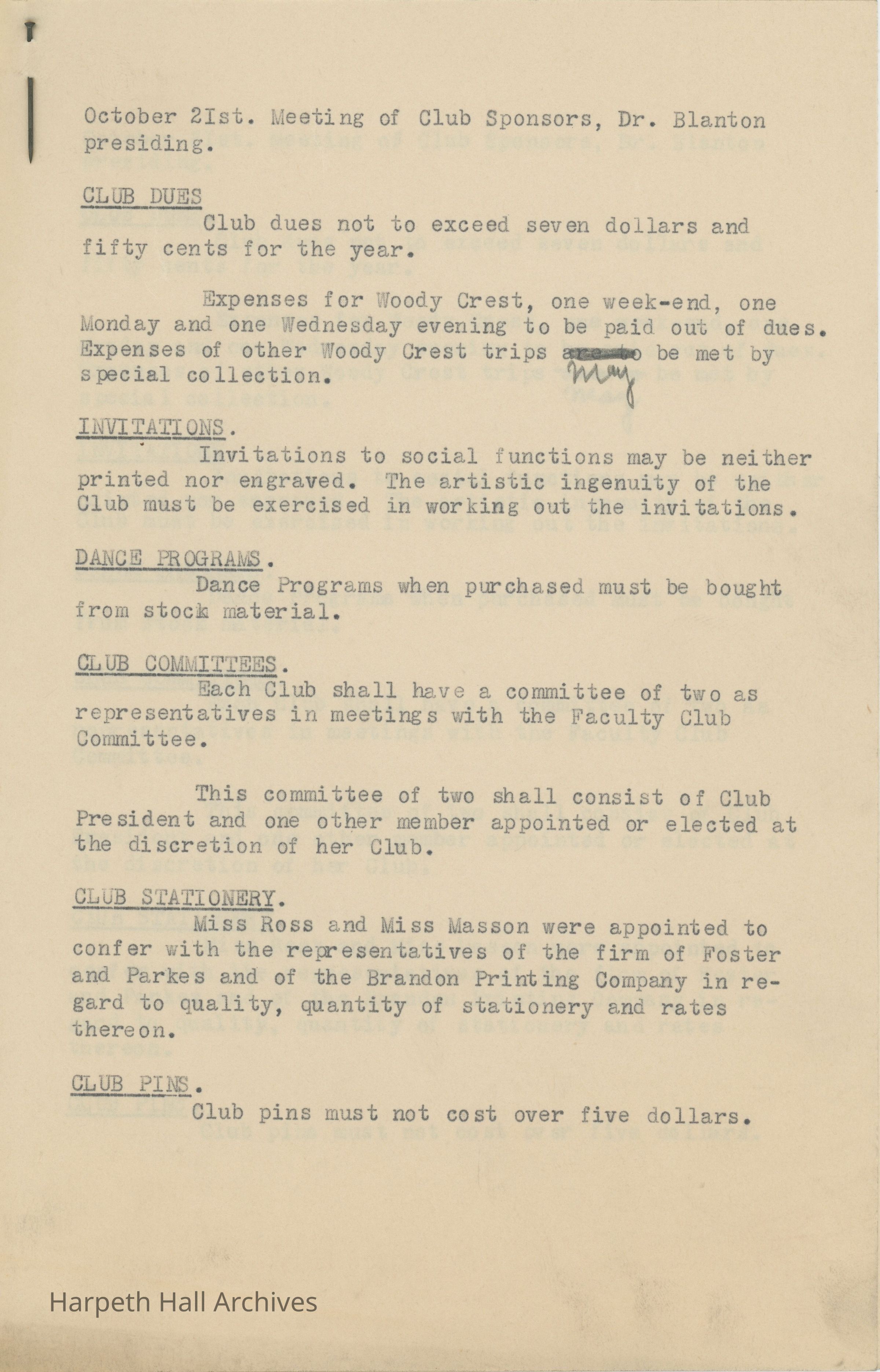 A document detailing an October 21st meeting of club sponsors, with Ward-Belmont President Dr. Blanton presiding. Business included club dues, invitations to social functions, dance programs, club committees, club stationary, and club pins.Context
