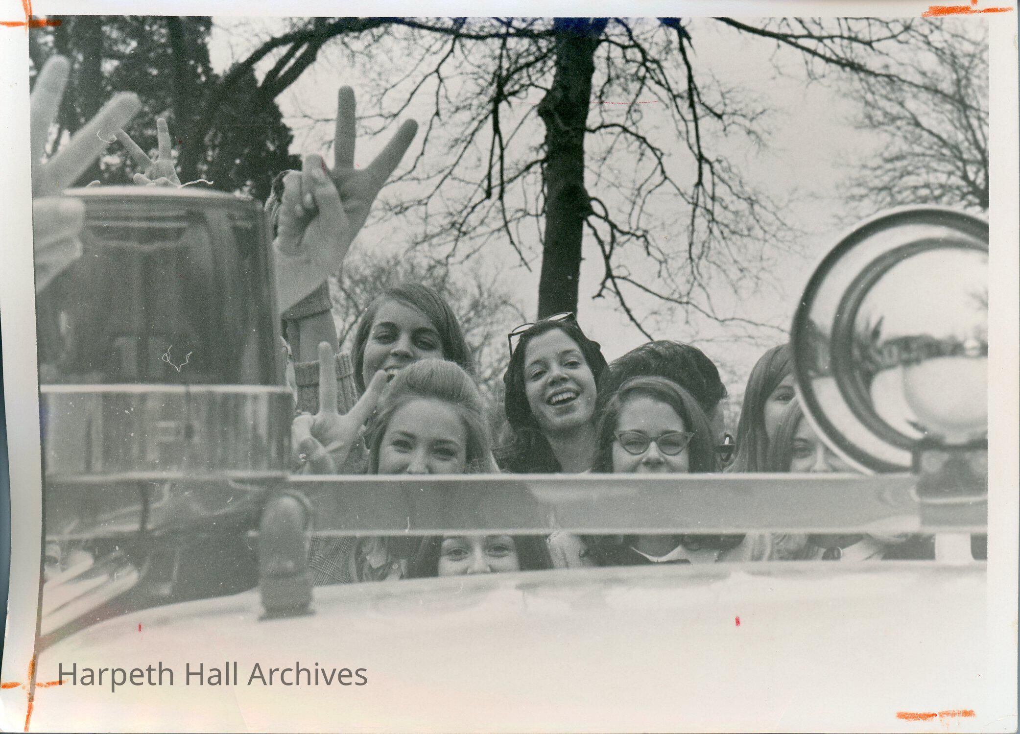 Rachel "Jane" Buchanan Corcoran (1969), Rachel Steele (1970) and others pose making the peace sign behind a vehicle that seems to be a police car in the 1960's