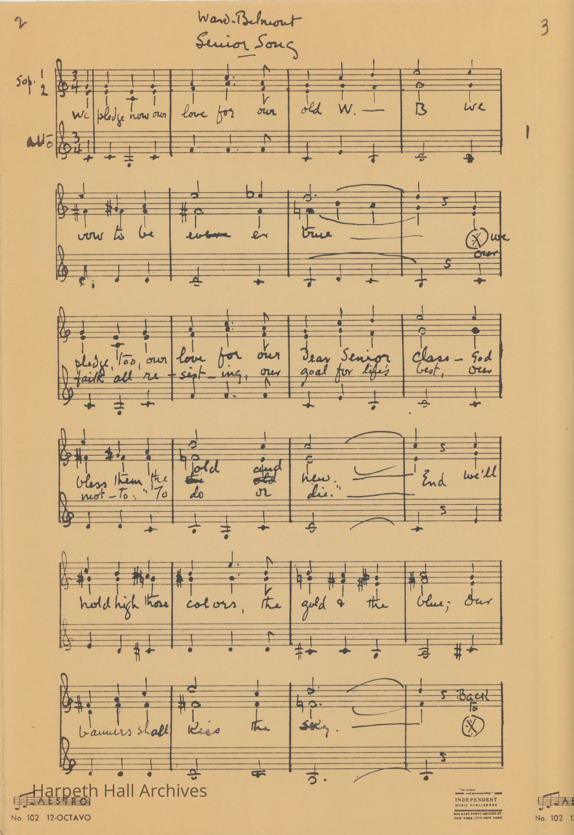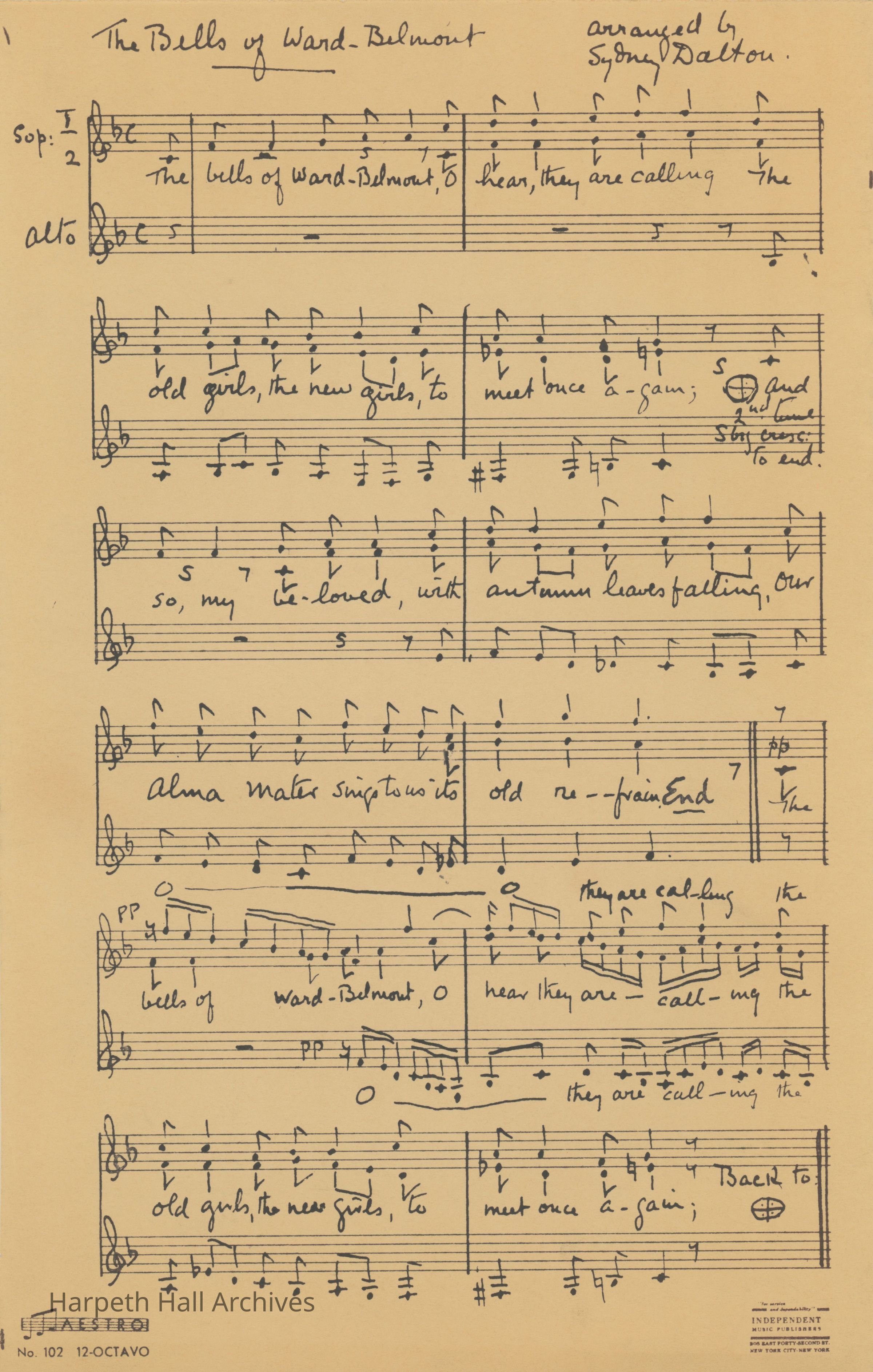 Sheet music and lyrics for the song "The Bells of Ward-Belmont" and the "Senior Song". Arranged by Sydney Dalton. Unknown year.Context