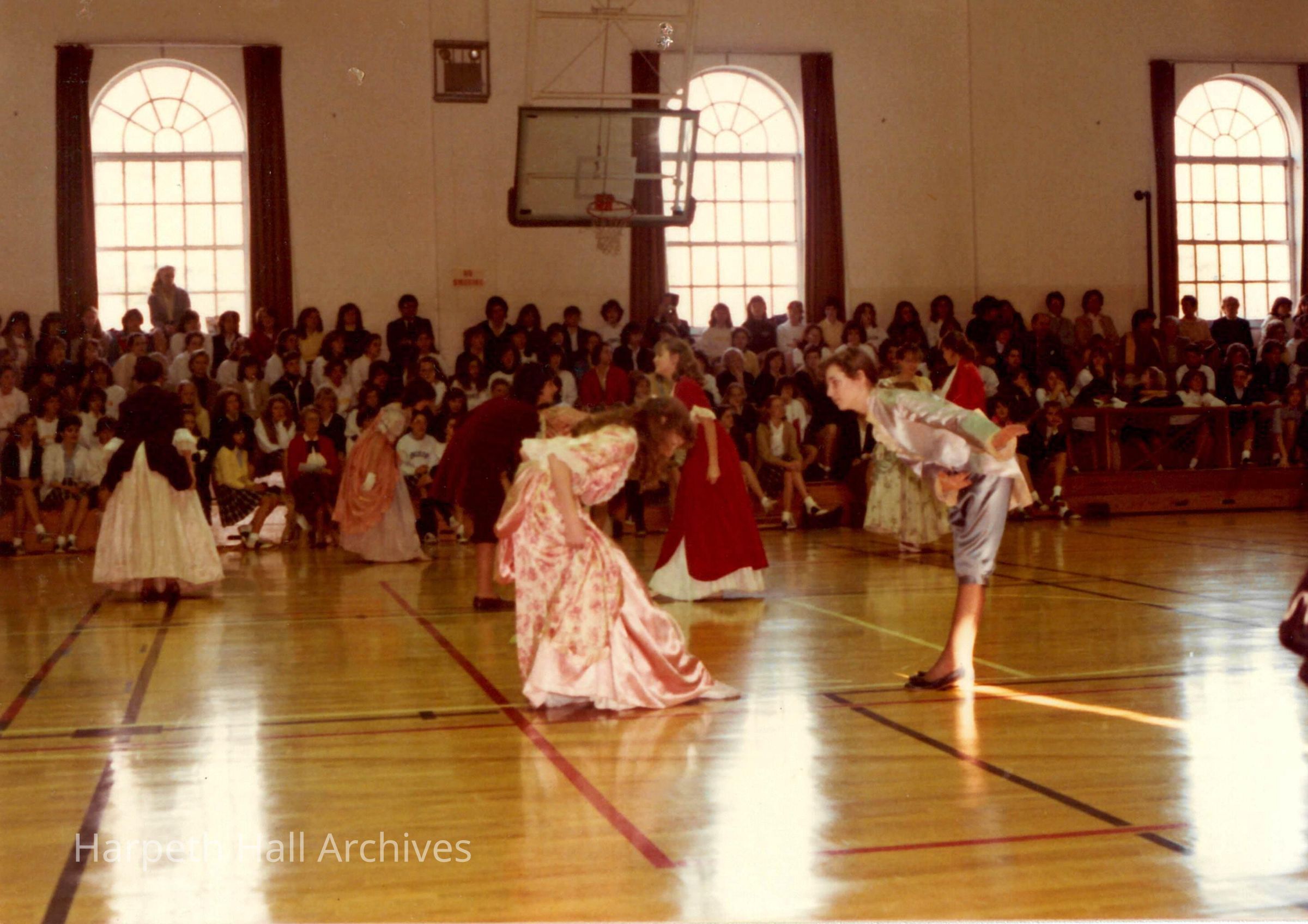 A group of seventh grade students performing a dance in the George Washington Day Celebration. The photo is taken in the Morrison Gym in the McMurry Center.Context