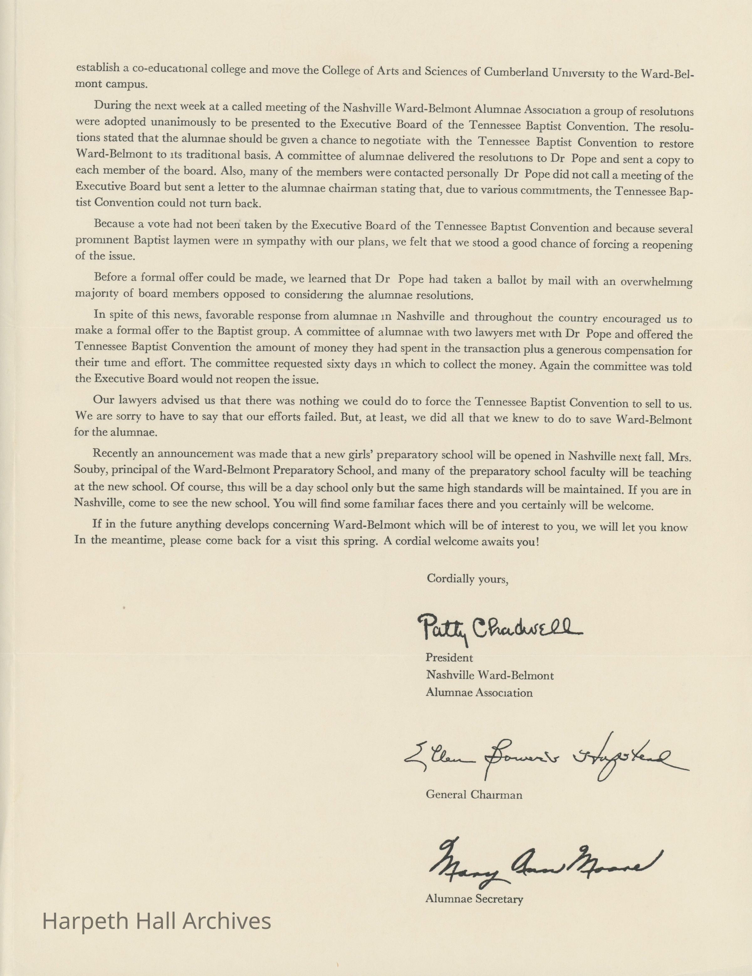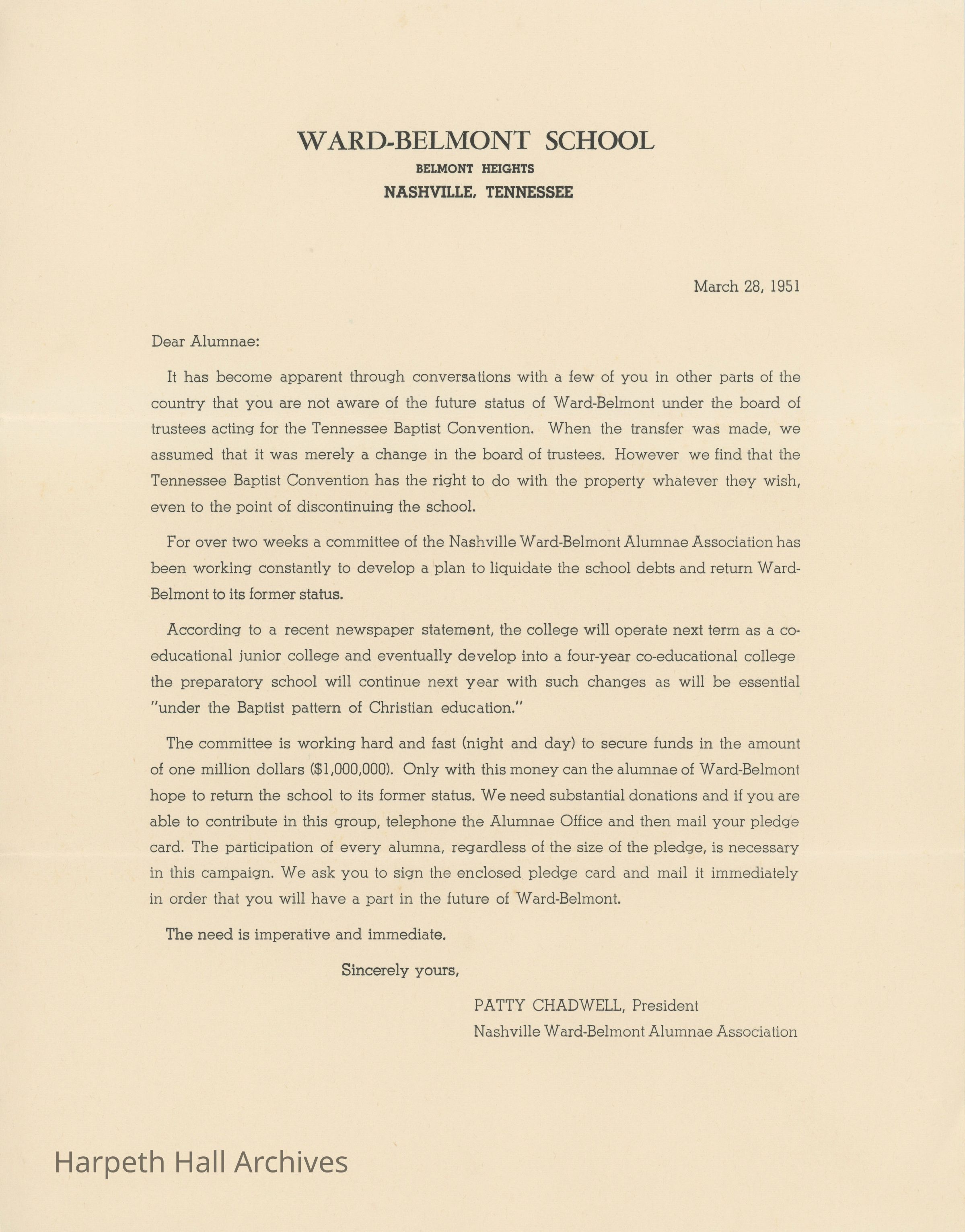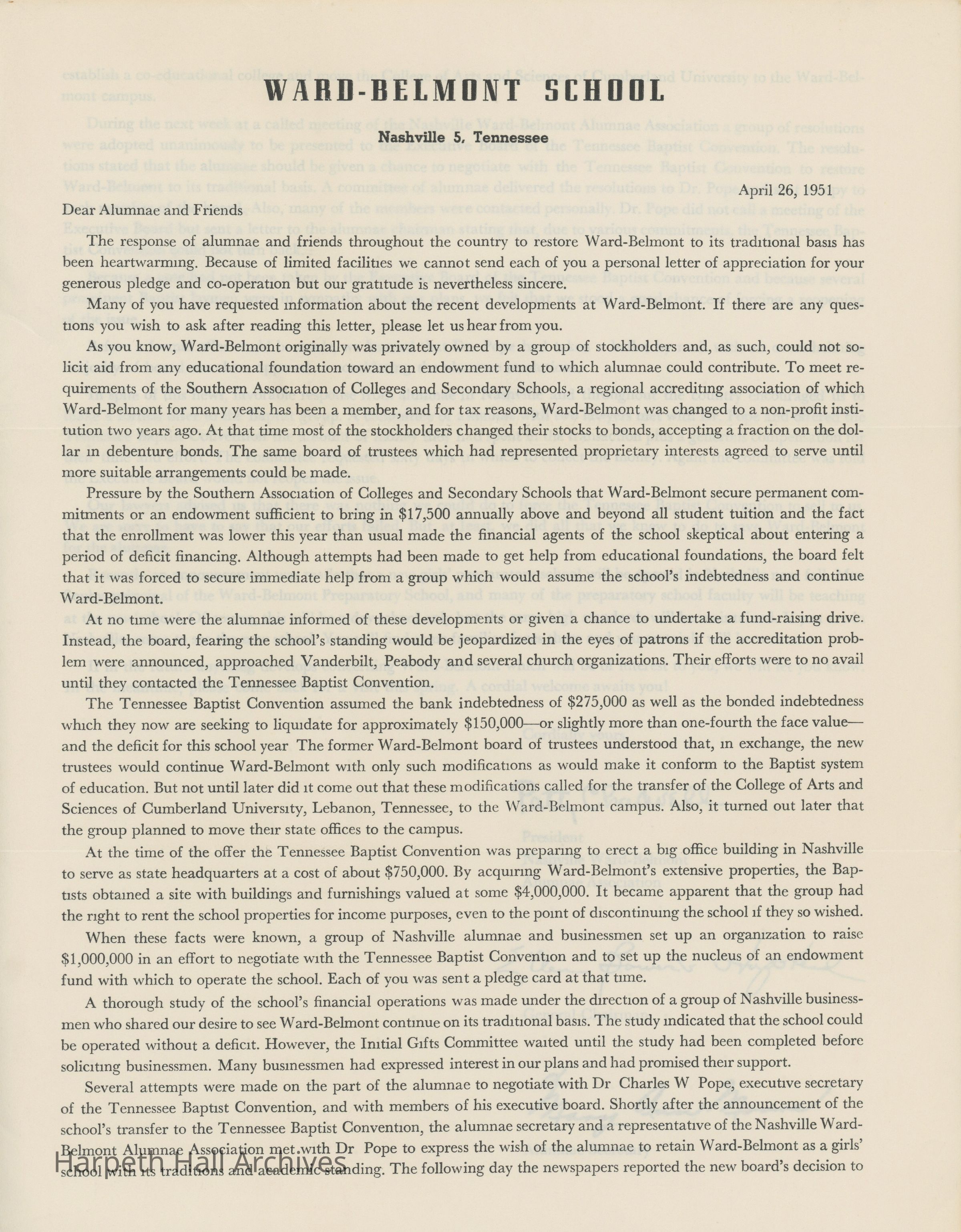 Letters to Ward-Belmont Alumnae Regarding Its Closing, 1951Entry/Object ID