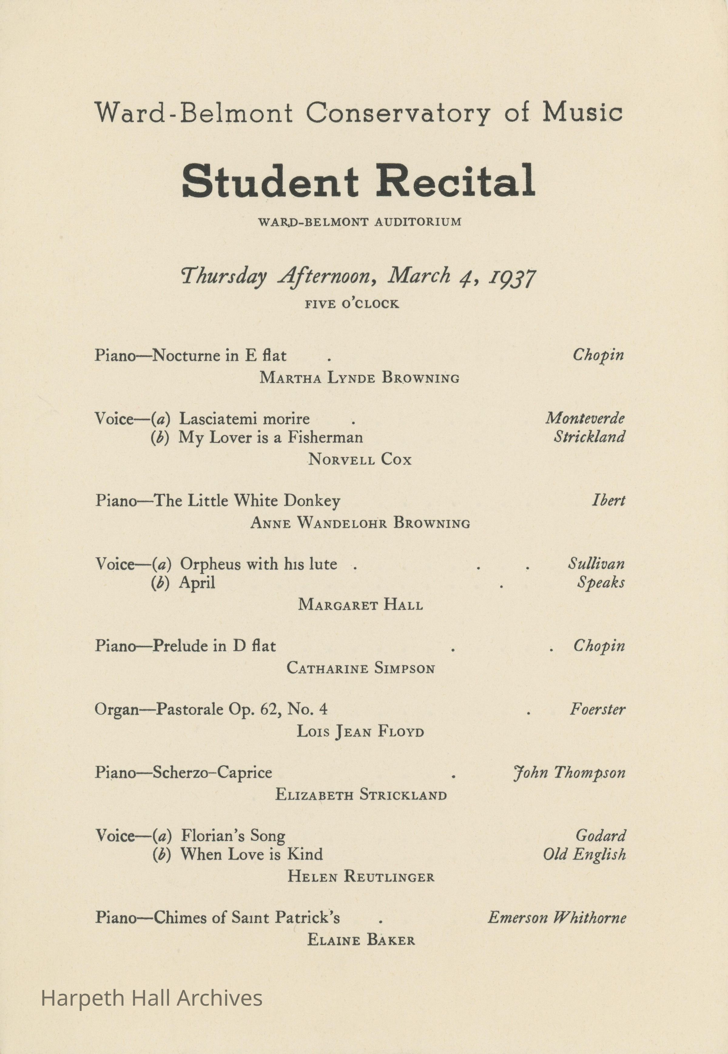 The program for the Ward-Belmont Conservatory of Music Student Recital on March 4th, 1937. 9 students performed during this recital.Collection