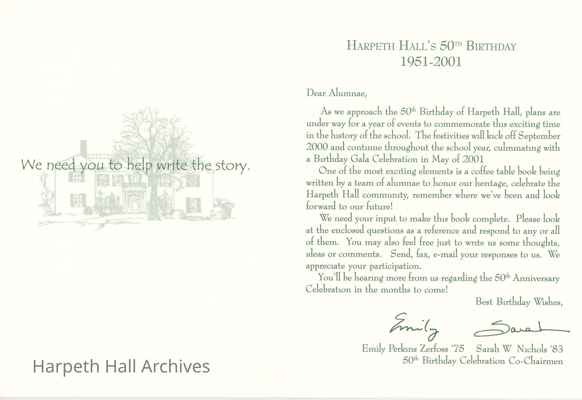 A letter to Harpeth Hall alumnae asking for their help in celebrating 50 years of the school. The letter was sent by the 50th Birthday Celebration Co-Chairmen Emily Perkins Zerfoss '75 and Sarah W. Nichols '83.Collection