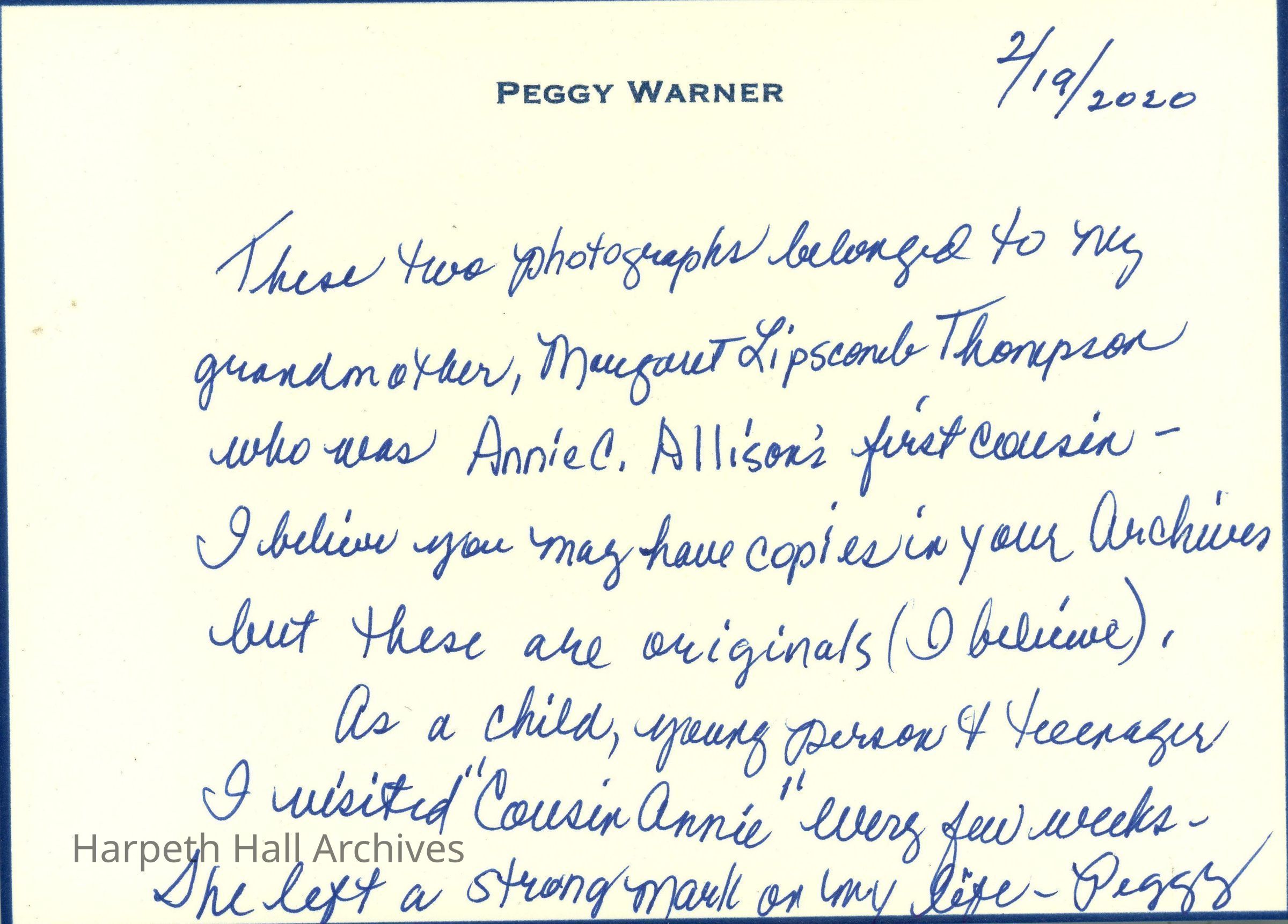 Two photographs of "Miss Annie" donated by Peggy Warner along with a handwritten note about her memories visiting "Cousin Annie" as a child and teenager. The photographs originally belonged to Mrs. Warner's grandmother, Margaret Lipscomb Thompson, who was Annie C. Allison's first cousin.Collection