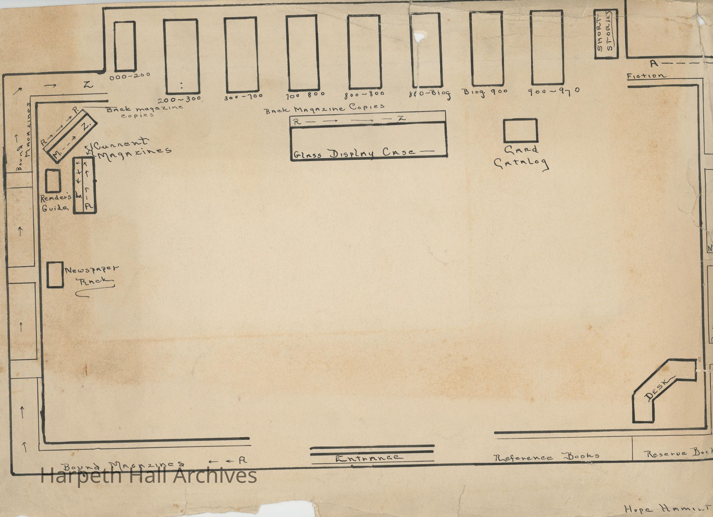A map of the Ward-Belmont school library, labeled by Hope Hamilton on October 1, 1940.Collection