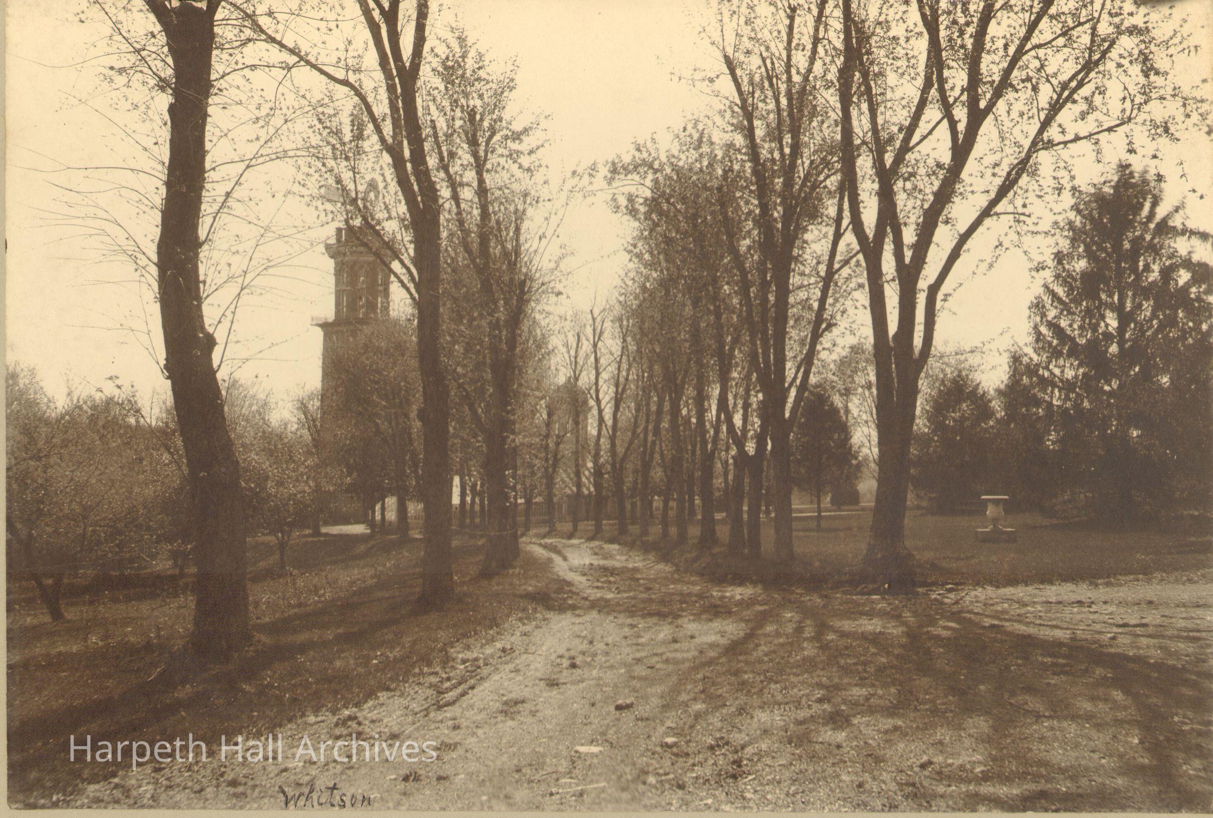 Picture of tree-lined path with bell tower visible in distance. Assume this is early picture of Ward-Belmont campus.