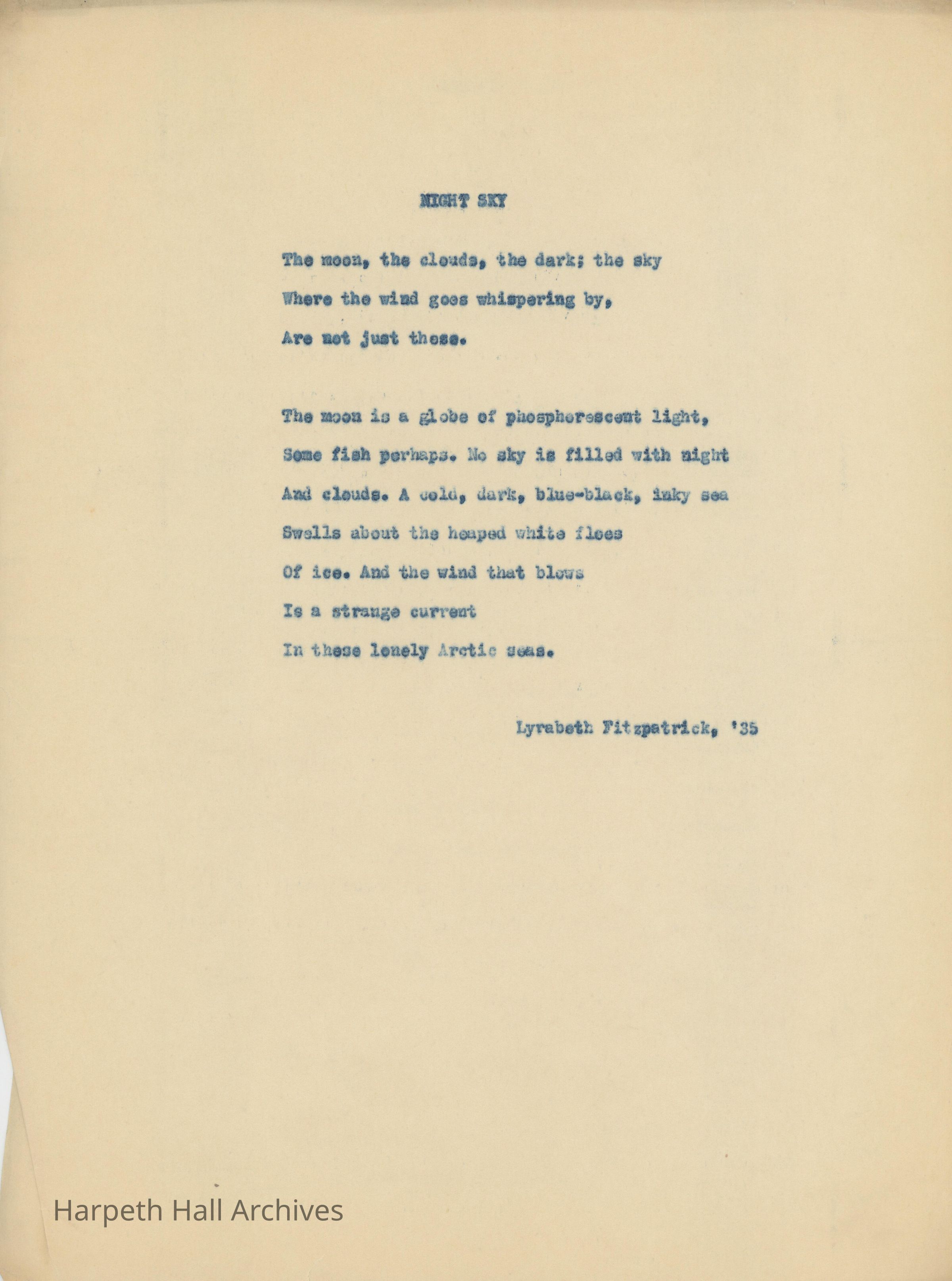 A poem entitled, "Night Sky" written by Ward-Belmont student Lyrabeth Fitzpatrick (1935).Collection