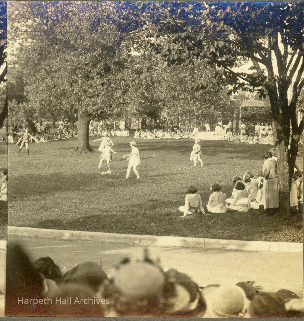 Belmont College for Women, circa 1919, women in white clothing walking around a tree with onlookers.
