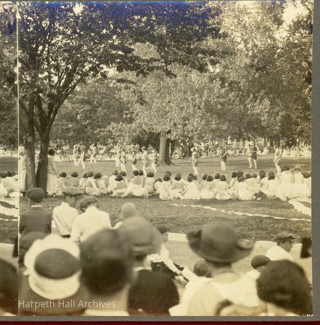 Belmont College for Young Women, circa 1910, women in gray clothing perform on lawn, while women in white are seated and onlooking with other spectators.Collection