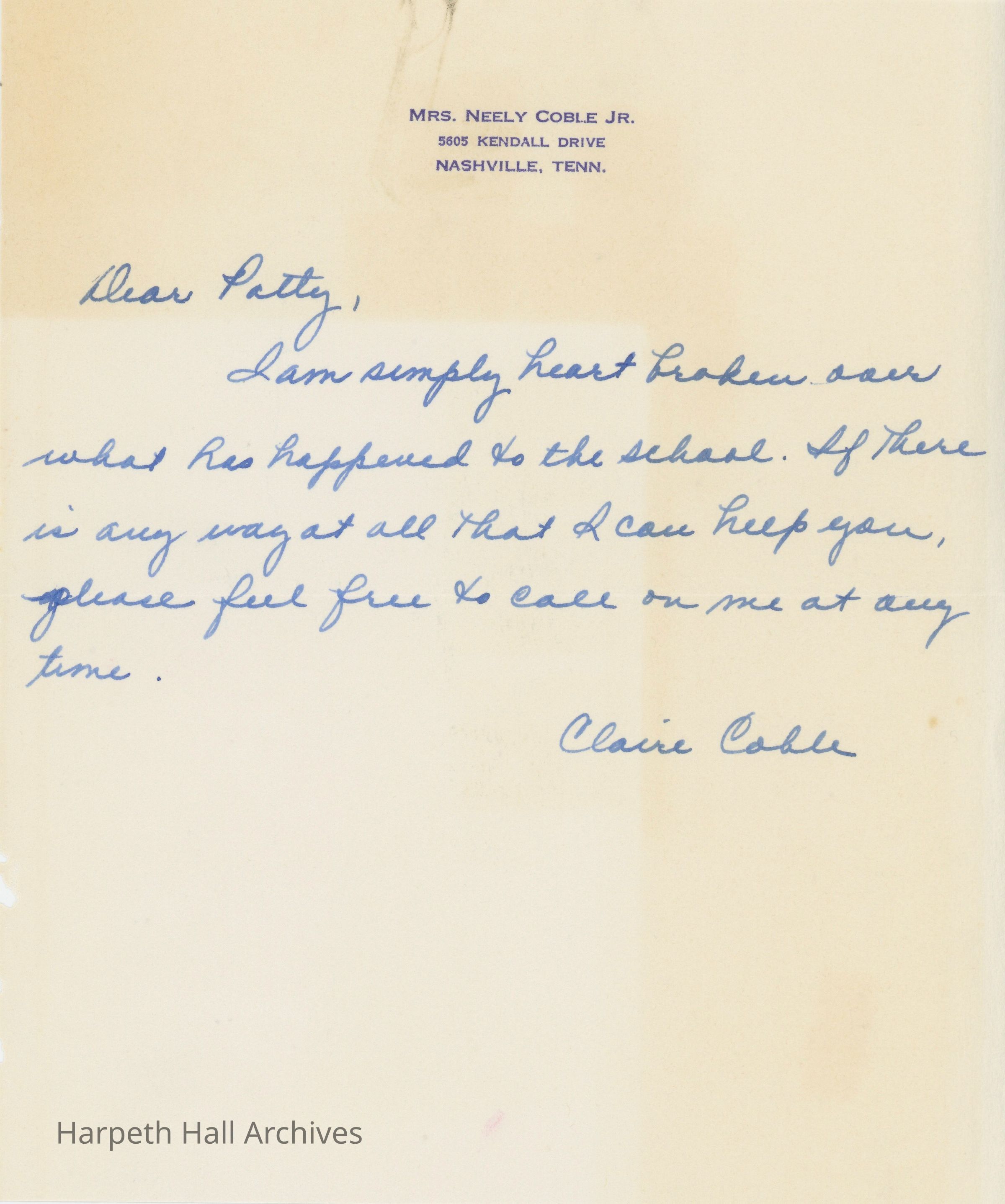 Letter to Patty Chadwell from Claire Coble who expresses her sadness after hearing the news of the Ward-Belmont sale to the Baptists.Collection