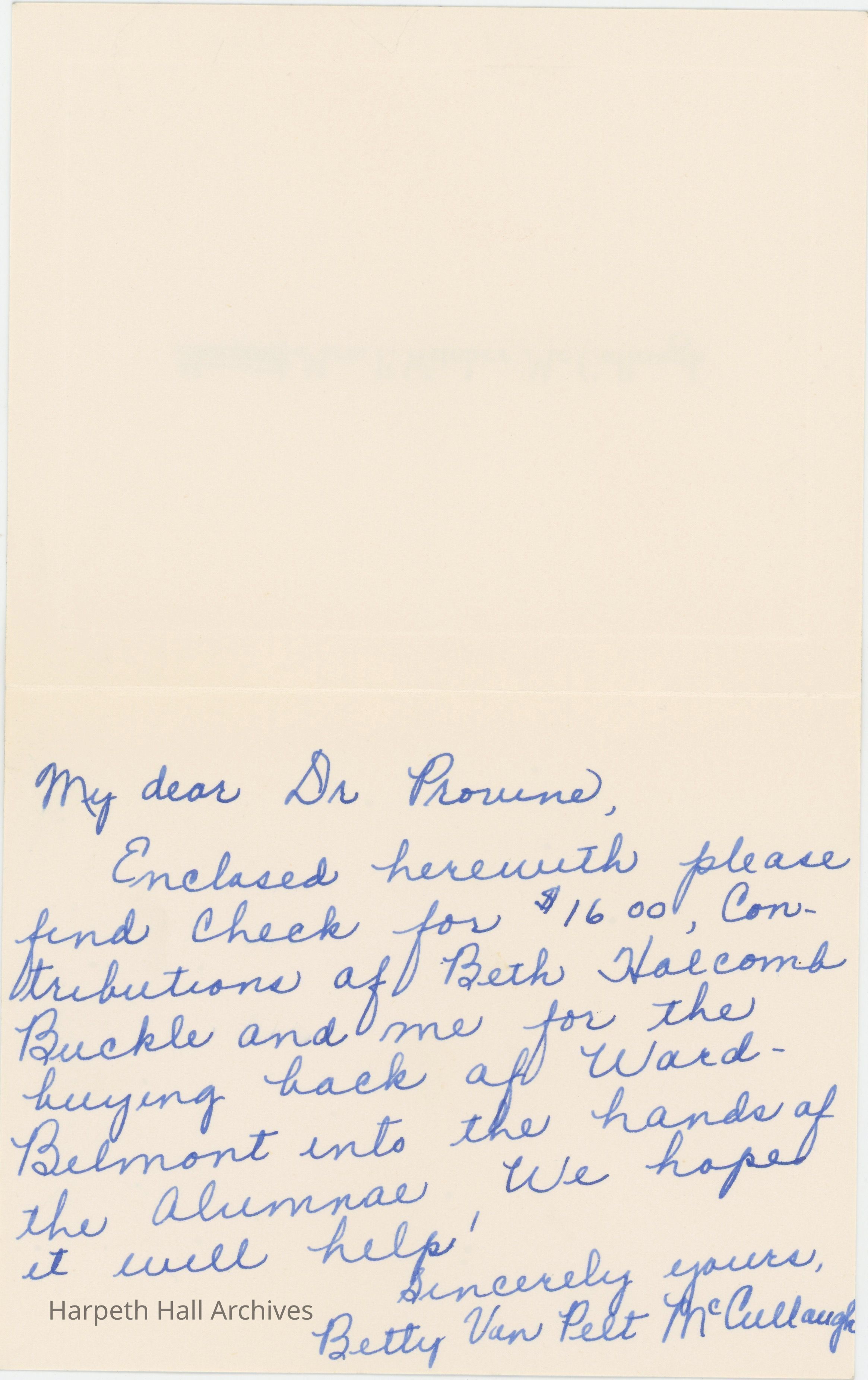 A letter from Mrs. McCullough and Beth Buckle that originally contained their pledge of $16.00 for the Alumnae Fund, a campaign aimed at raising money to buy Ward-Belmont back from the Tennessee Baptist Convention.Collection