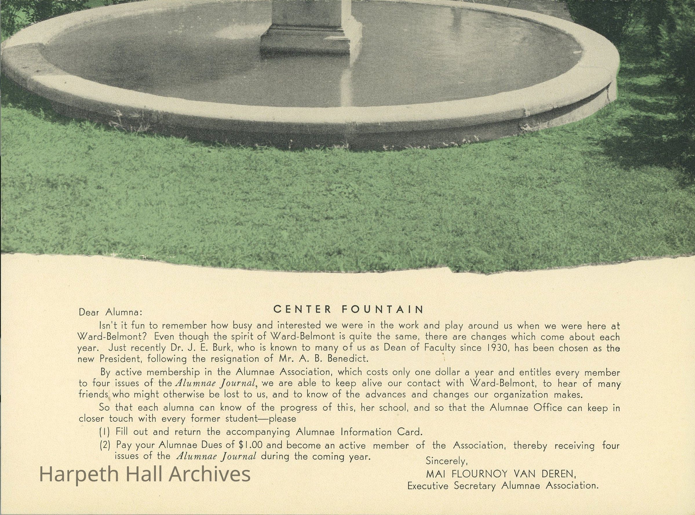 Correspondence sent to Ward-Belmont alumnae from Mai Flournoy Van Deren, Executive Secretary of the Alumnae Association. The letter featured a color photo of the Center Fountain on Ward-Belmont's campus. Van Deren informs alumnae of a recent change in school leadership (the resignation of Mr. Andrew Bell Benedict as president and the choice of his successor, Dr. Joseph E. Burk) and requests that they fill out and return an enclosed Alumnae Information Card and pay alumnae dues of $1.00 in order to become an active member of the Alumnae Association. Members received four issues of the Alumnae Journal throughout the year.Context