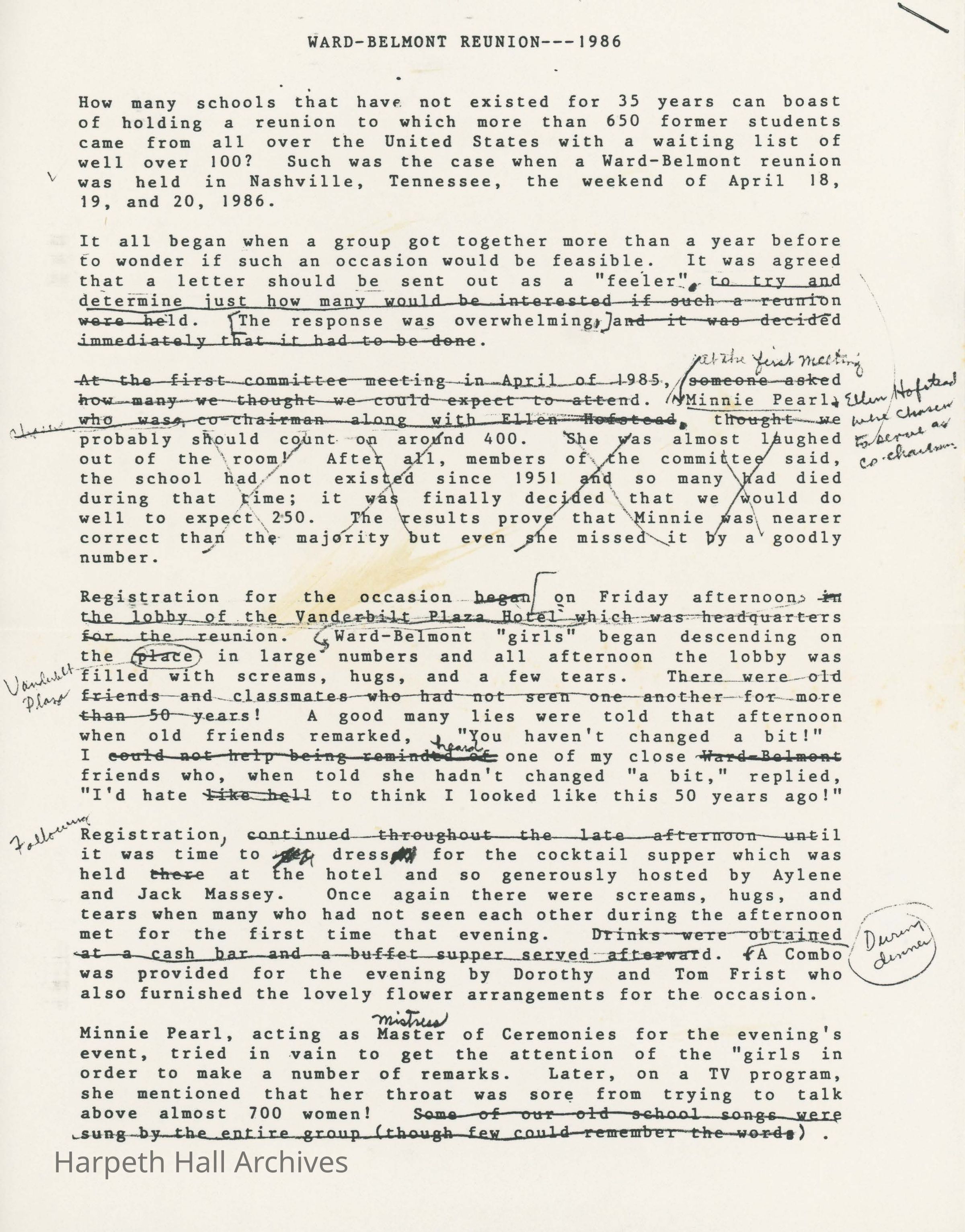 Speech made by Gilbertine Moore, Class of 1935, at a Ward Belmont Reunion event in 1986. Includes a draft of the speech with edits.Relationships