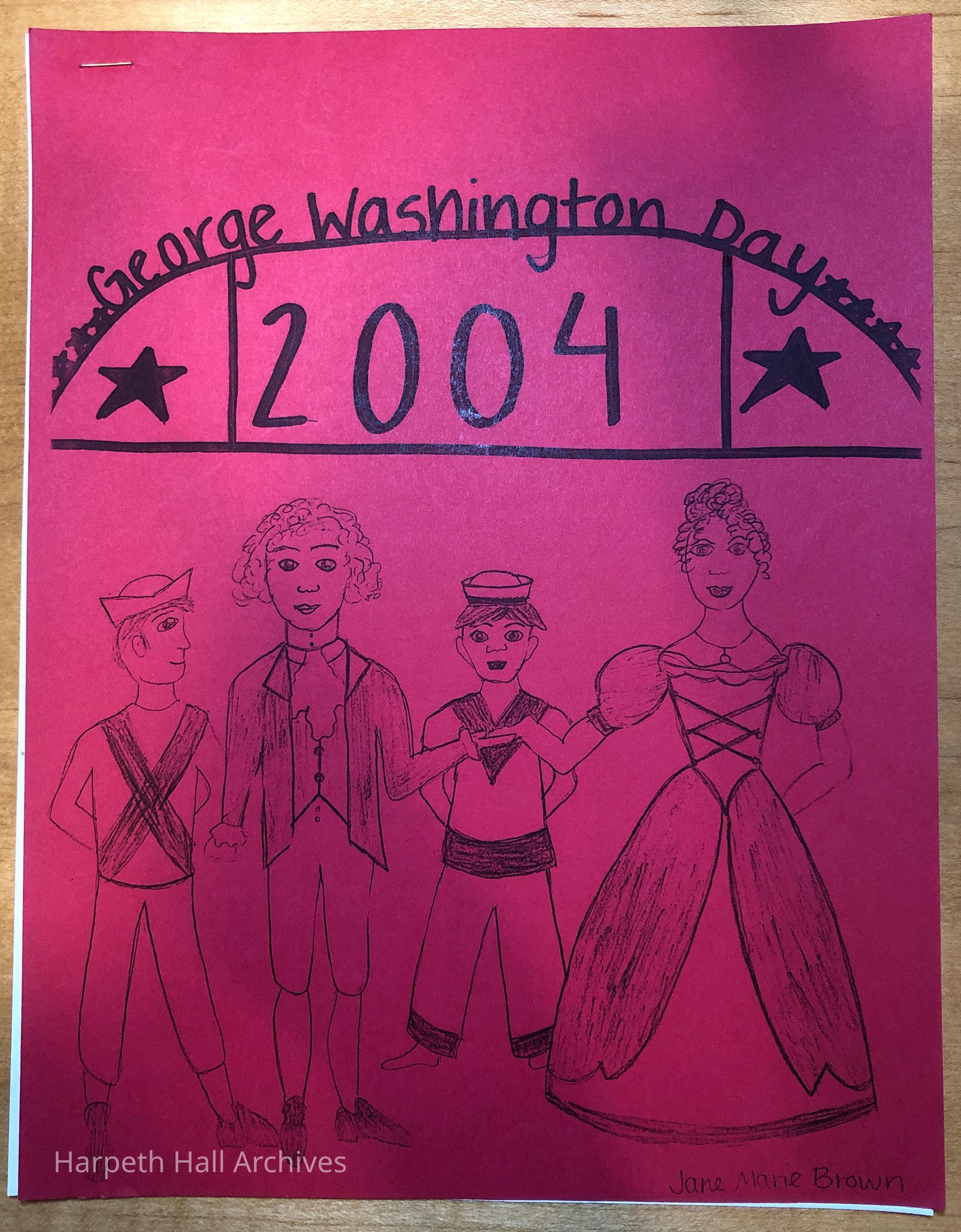 The 2004 program for the George Washington Day Celebration put on by the class of 2009 when they were in the seventh grade. The celebration was dedicated to soldiers who have served in Iraq or Afghanistan. George Washington was played by eighth grader Allison "Allie" Carver Rufat (2008) and Martha Washington was played by eighth grader Macy Hughart. Front cover design by Jane Marie Brown Young (2009).Context