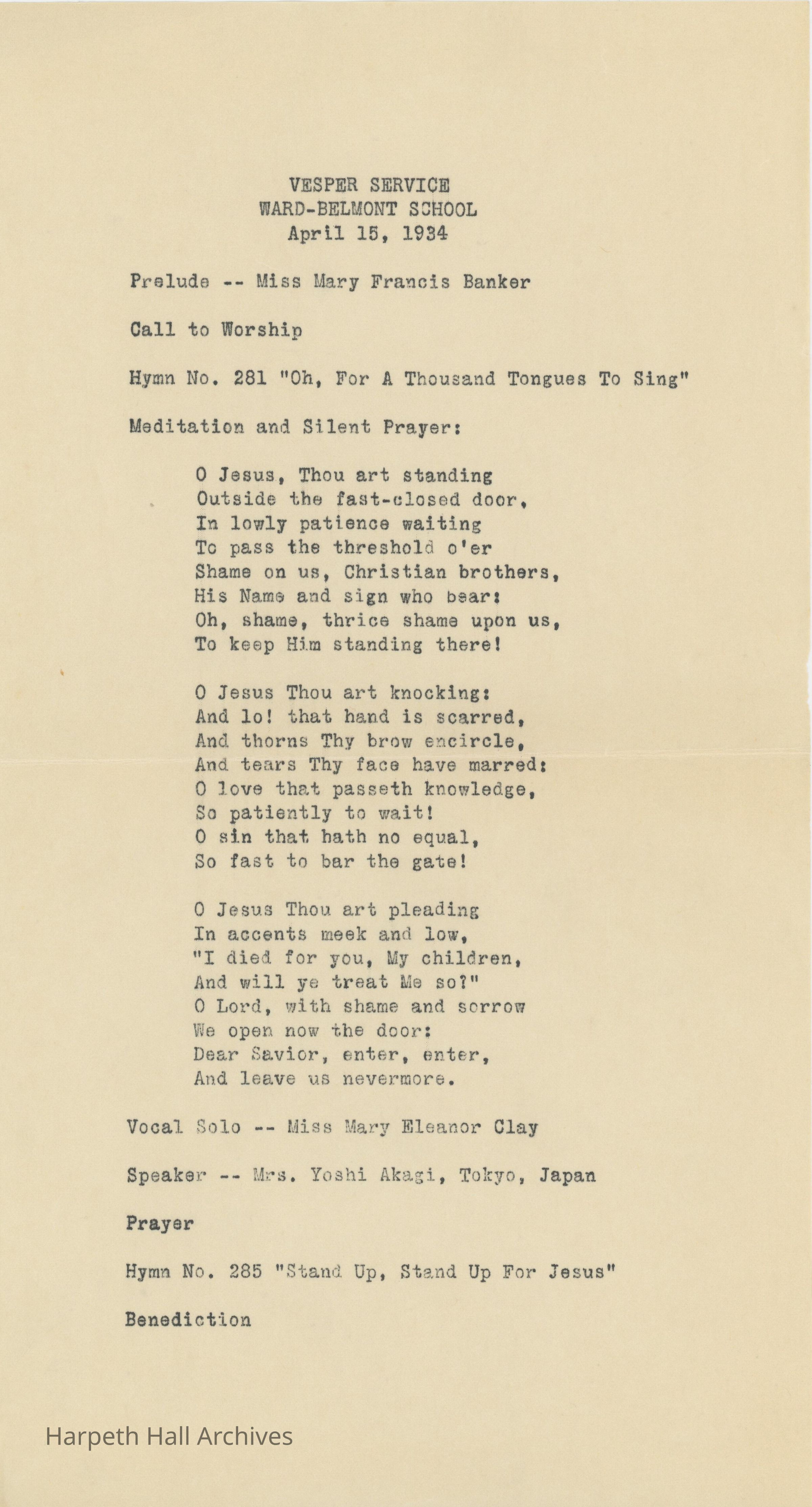 The program for the Ward-Belmont Vesper Service on April 15th, 1934.Collection