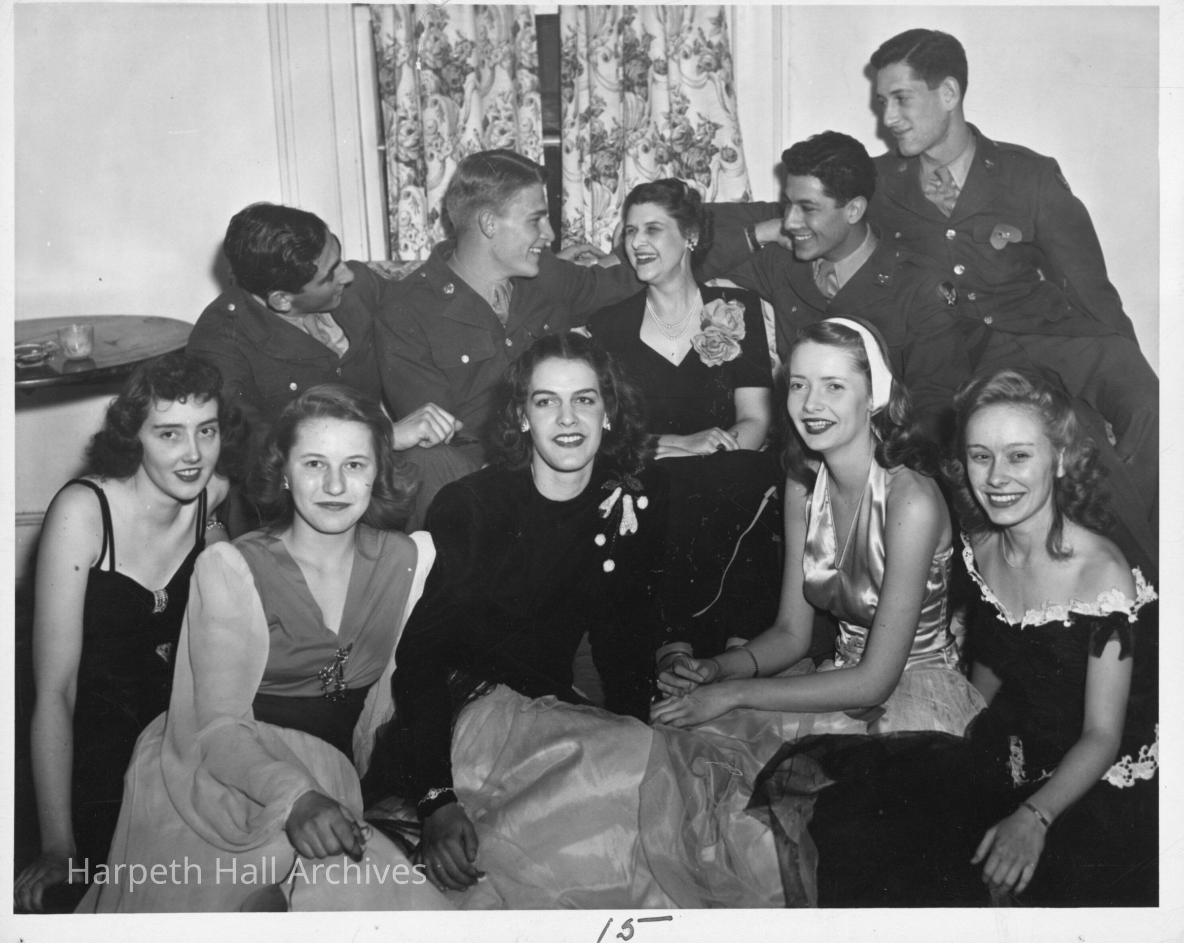 Group scene at a party. Five young women in formal gowns seated on the floor. One older woman, probably a faculty member, seated on a couch with four young men in military uniforms seated smiling on either side. One man has a heart pinned to his jacket, suggesting this could have been the Valentine's Day Banquet. Small tear in upper middle of picture.