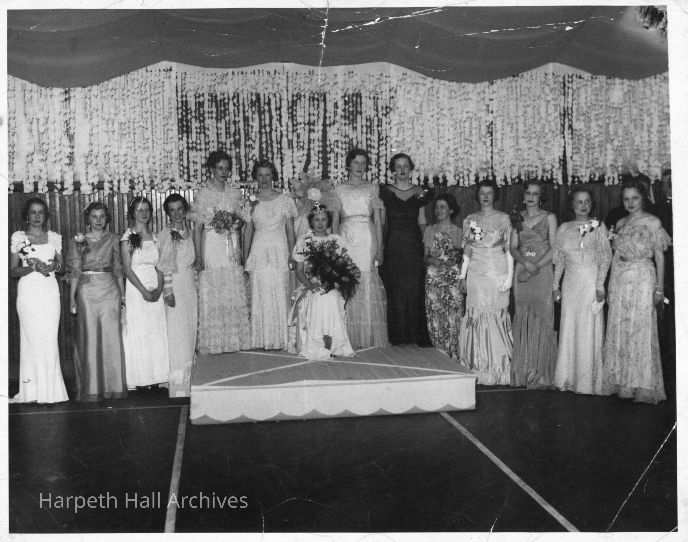 9 women standing on stage with four standing on a dais and one seated on a chair wearing a crown. All are wearing flowers or holding bouquets and are wearing very formal dresses. Possibly a fashion show or beauty pageant.