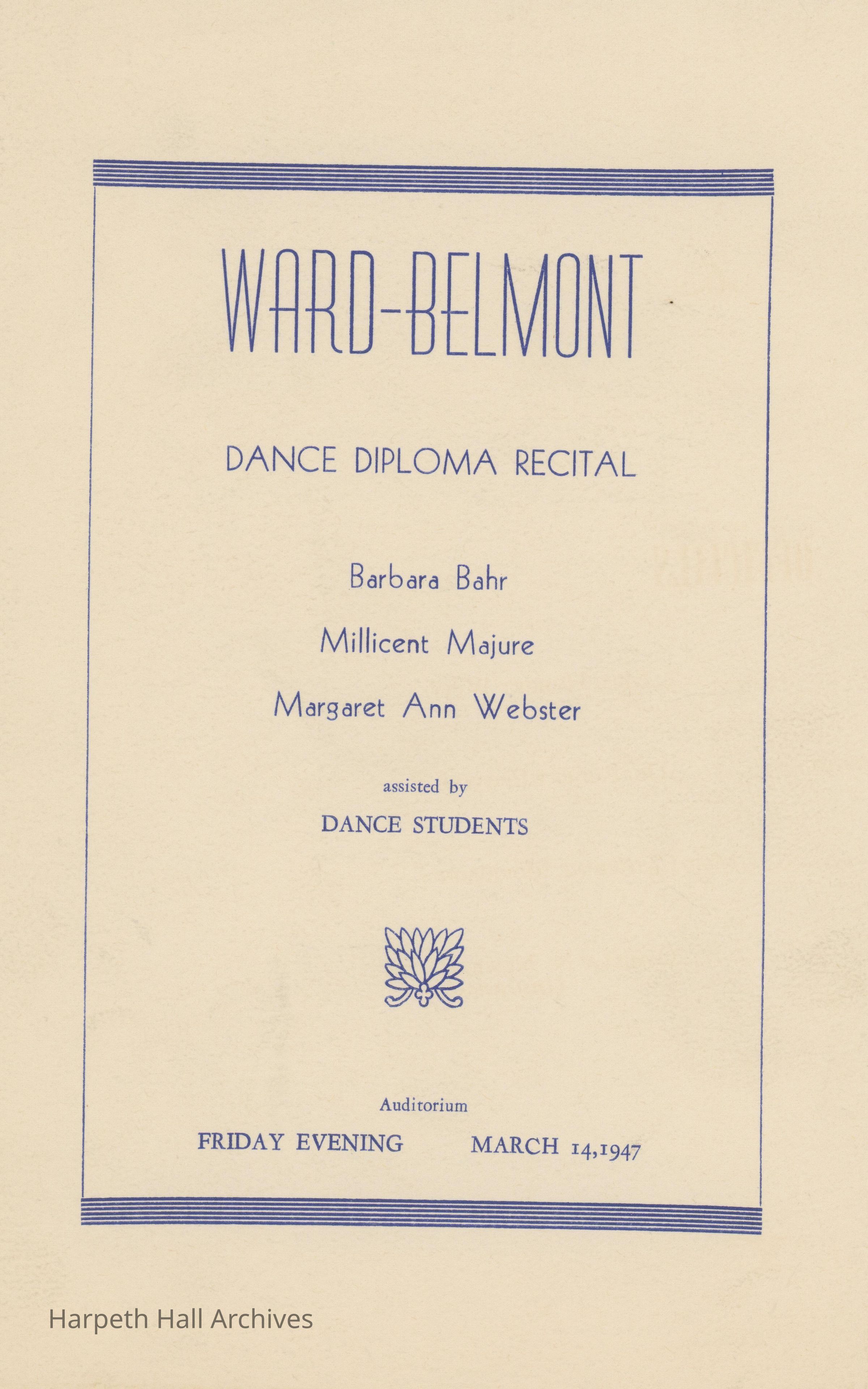 A program for the 1947 Ward-Belmont dance diploma recital, featuring Barbara Bahr, Millicent Majure, and Margaret Ann Webster, assisted by dance students. Held in the Ward-Belmont auditorium on Friday evening, March 14, 1947. The recital consisted of two parts, with five dances in Part I and six dances in Part II. The 1947 Milestones yearbook stated "the three professionals [...] originated and gave a most colorful major recital in March."Context