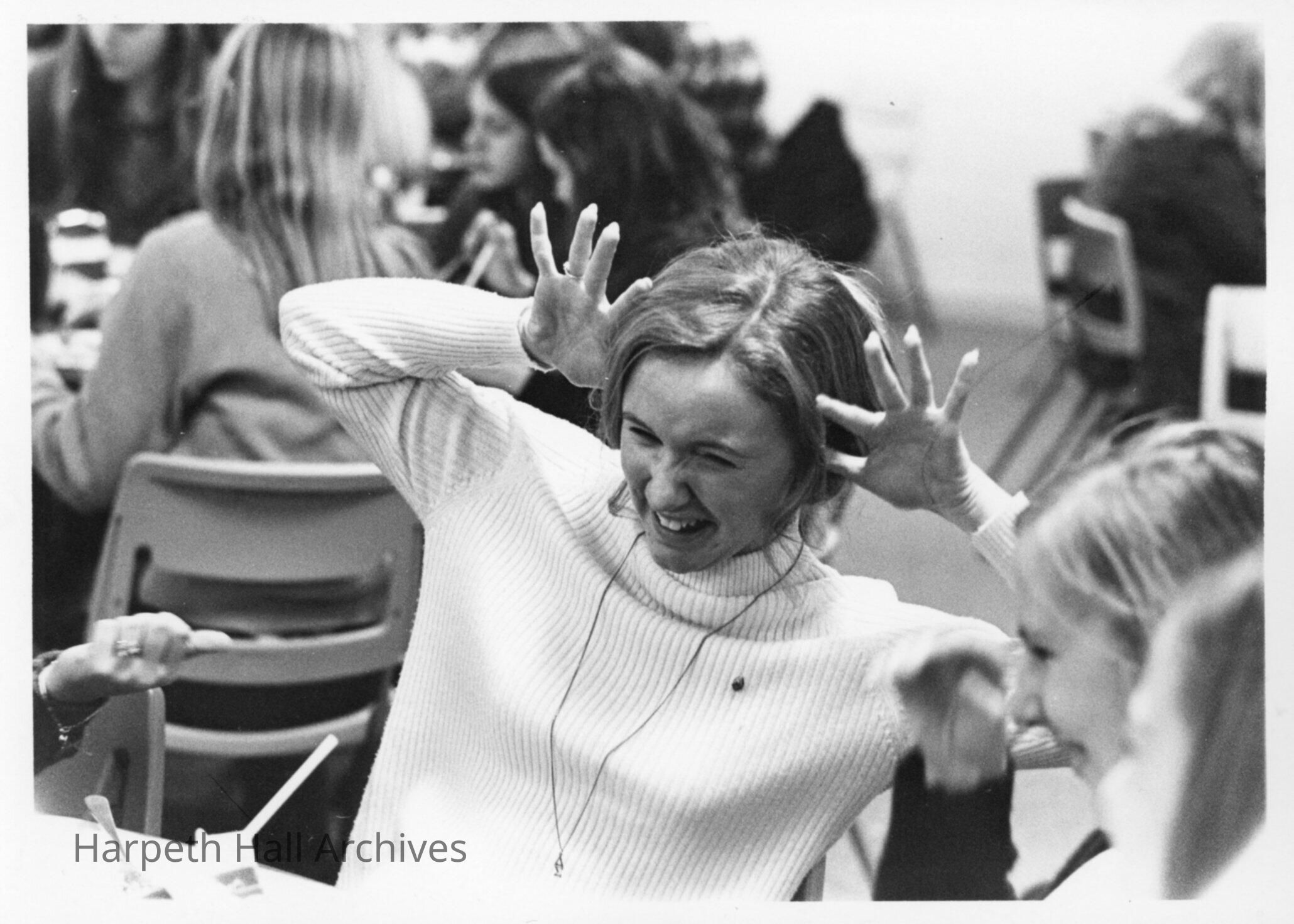 Girls seated, probably in cafeteria. Pictured: Rebecca "Becky" White Trimble (1973)