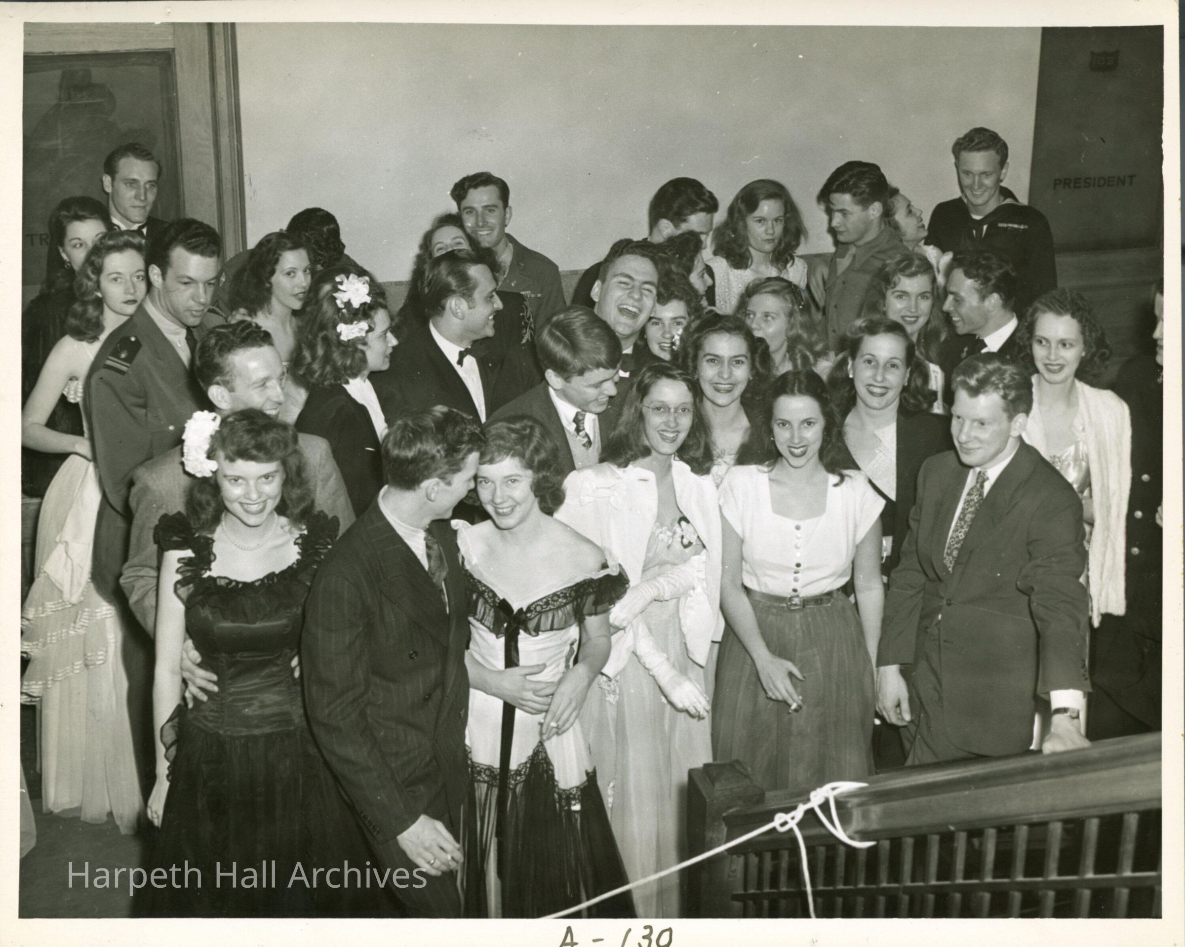 Group of people standing at the foot of the stairs. Women in party dresses and men in suits and military uniforms. Probably from a club dance. Picture appears in 1946 Milestones under caption "Formal party fun."