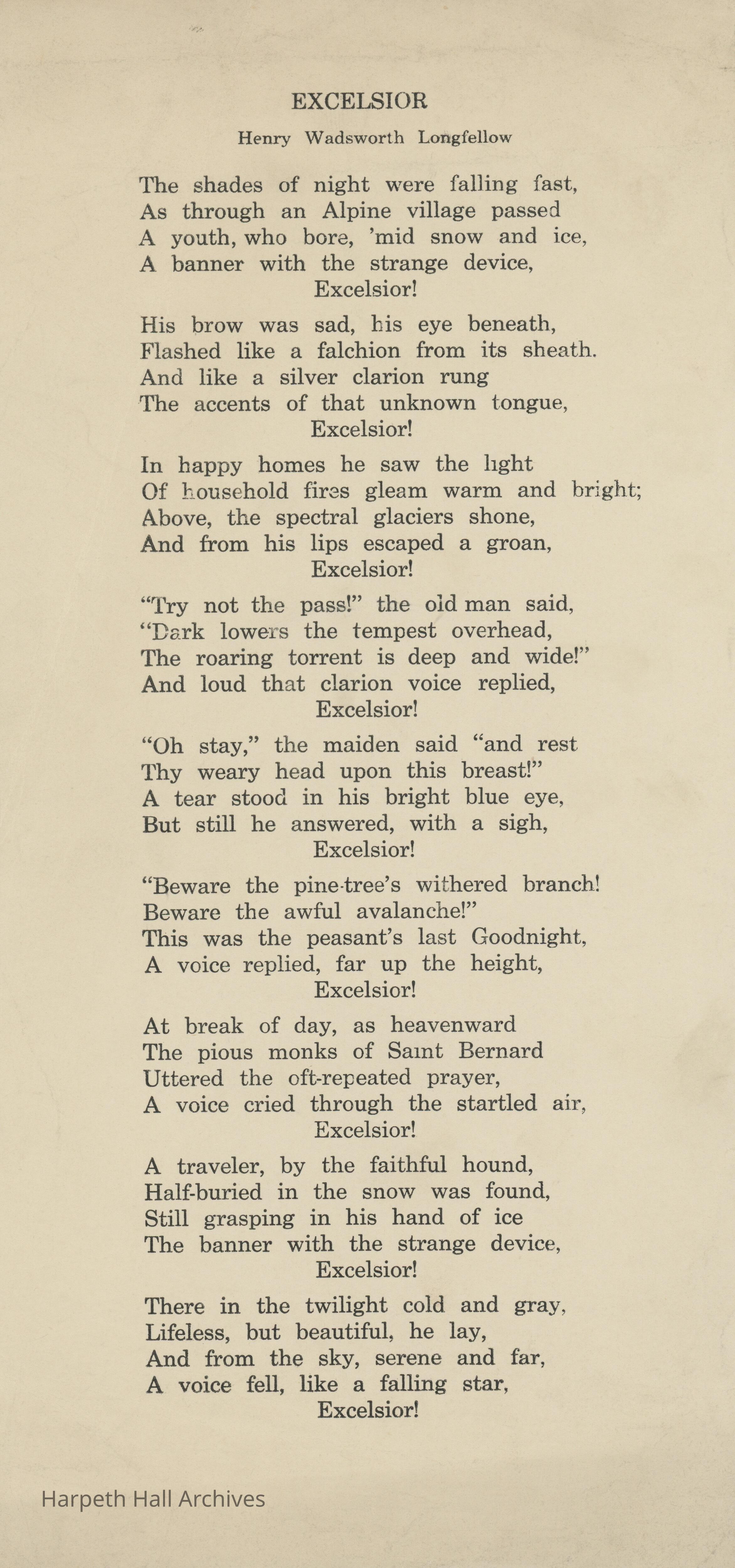 A poem entitled, "Excelsior" written by Henry Wadsworth Longfellow. This poem was studied by Ward-Belmont students.Collection