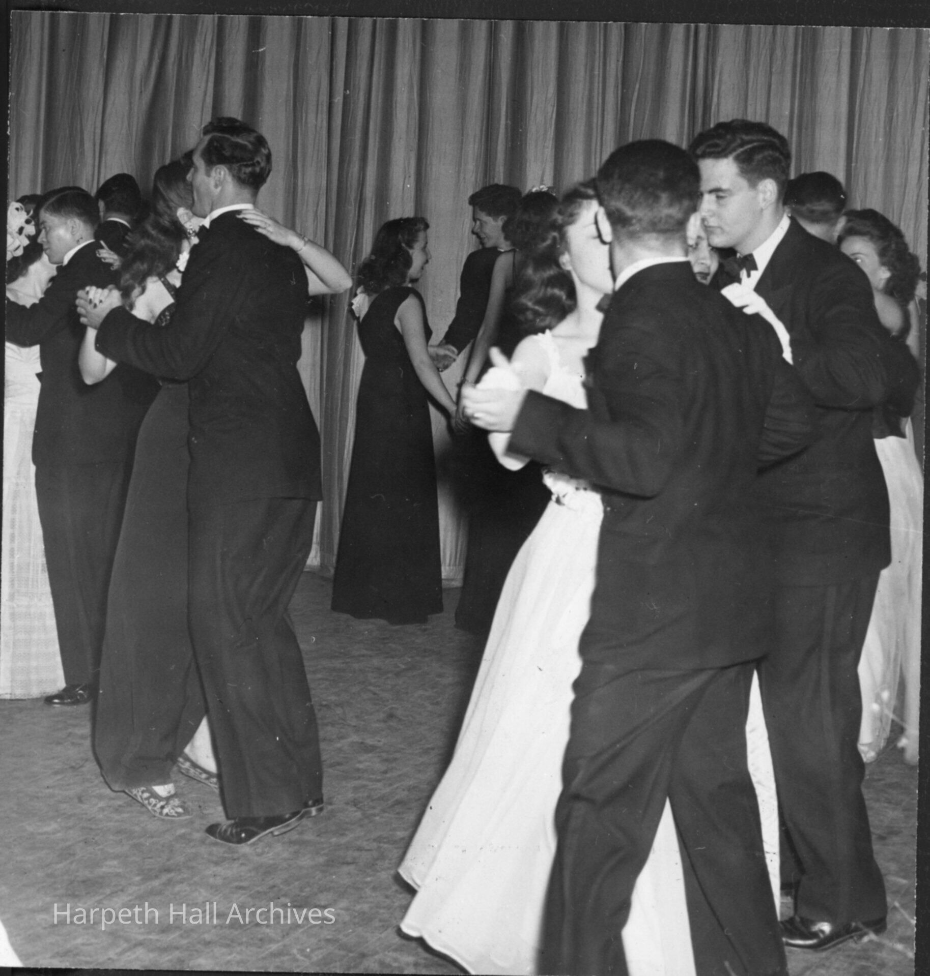Couples dancing. Women in formal gowns and men in suits or tuxedos. Picture appears in 1946 Milestones under caption, "Formal party fun."