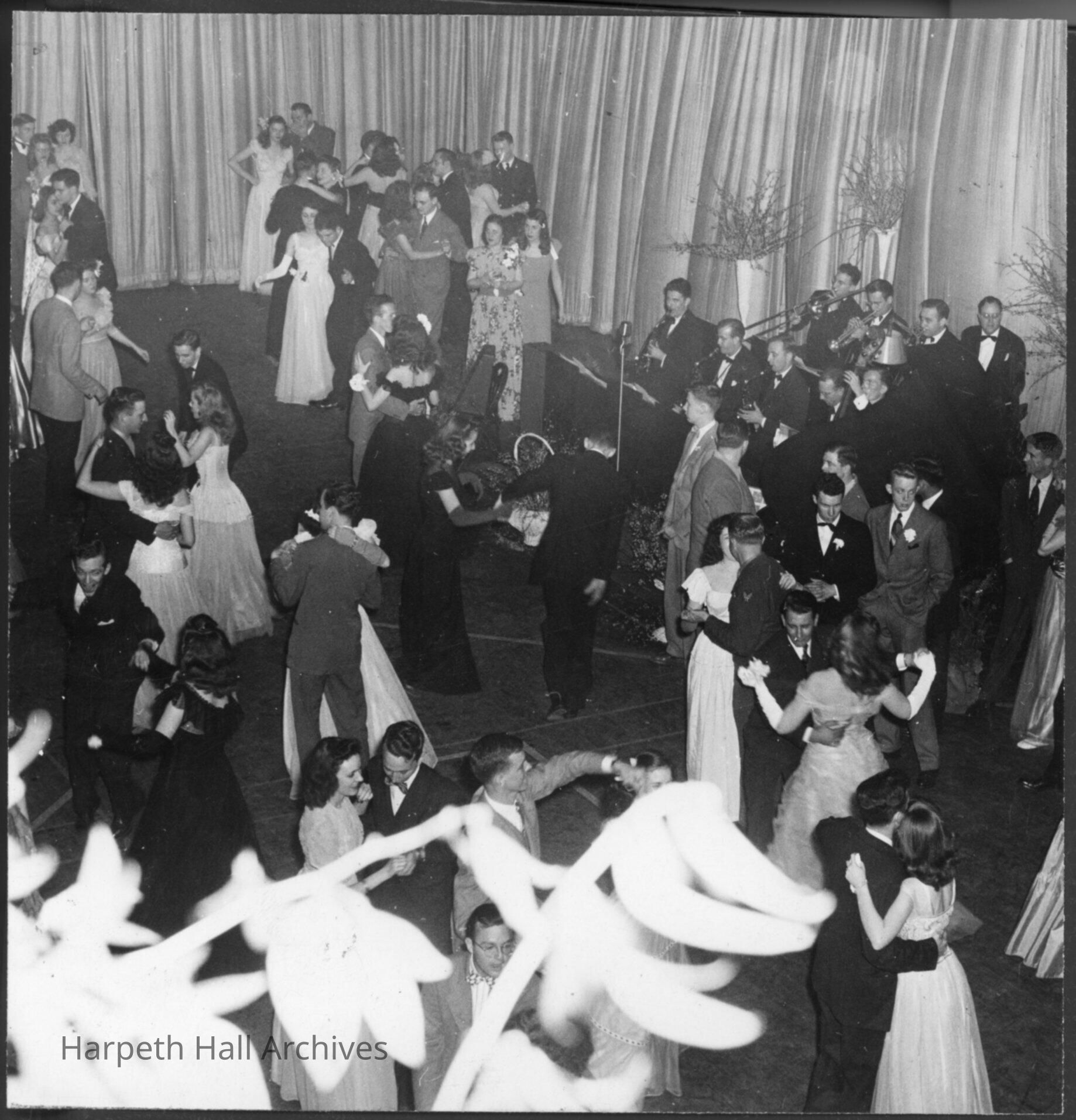Couples dancing in formal attire, women in evening gowns and men in suits and tuxedos. A jazz band is visible and the walls are curtained. Picture appears in 1946 Milestones under caption, "Formal party fun."
