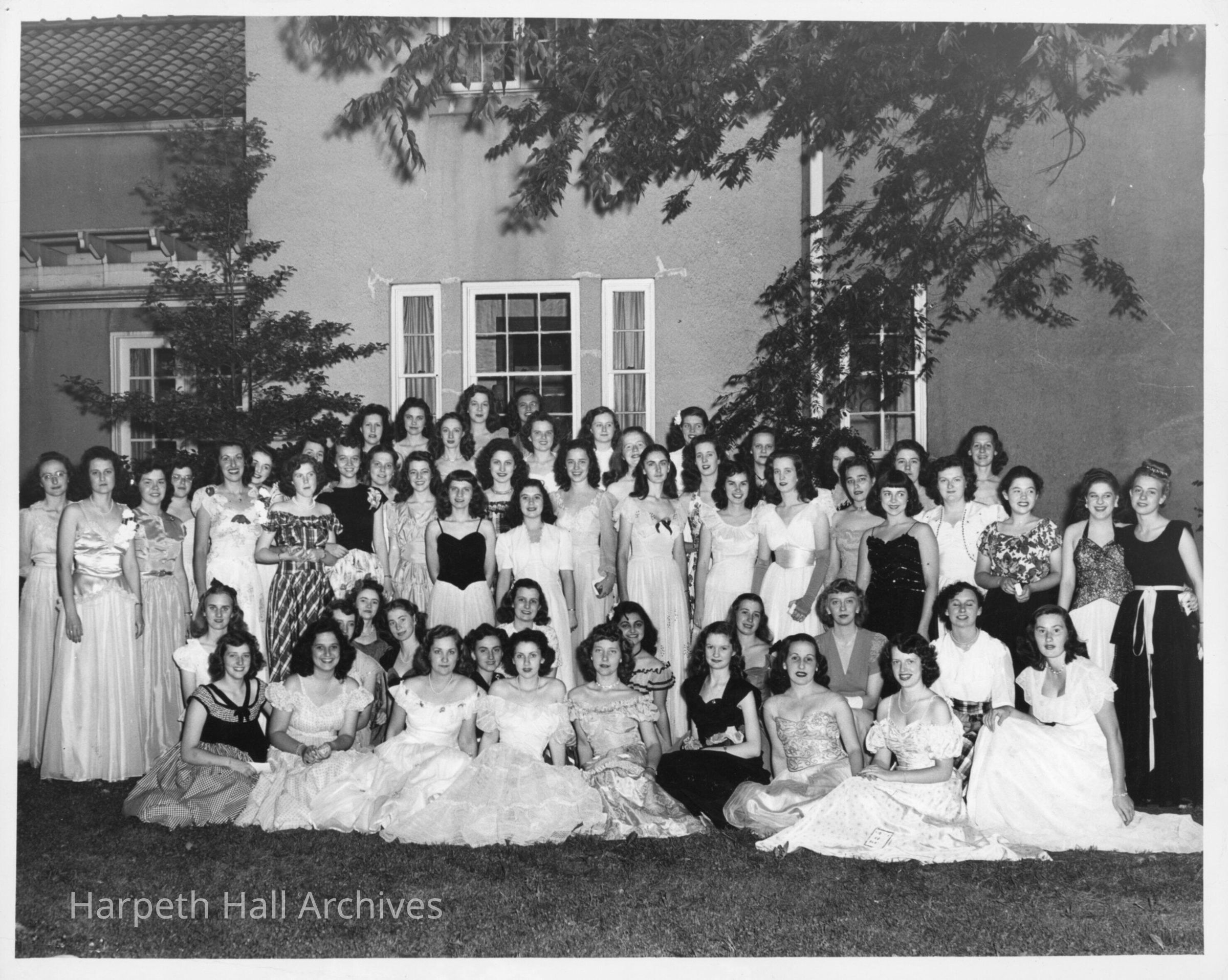 Young women in evening gowns posed outside in a group, probably in front of a club house.