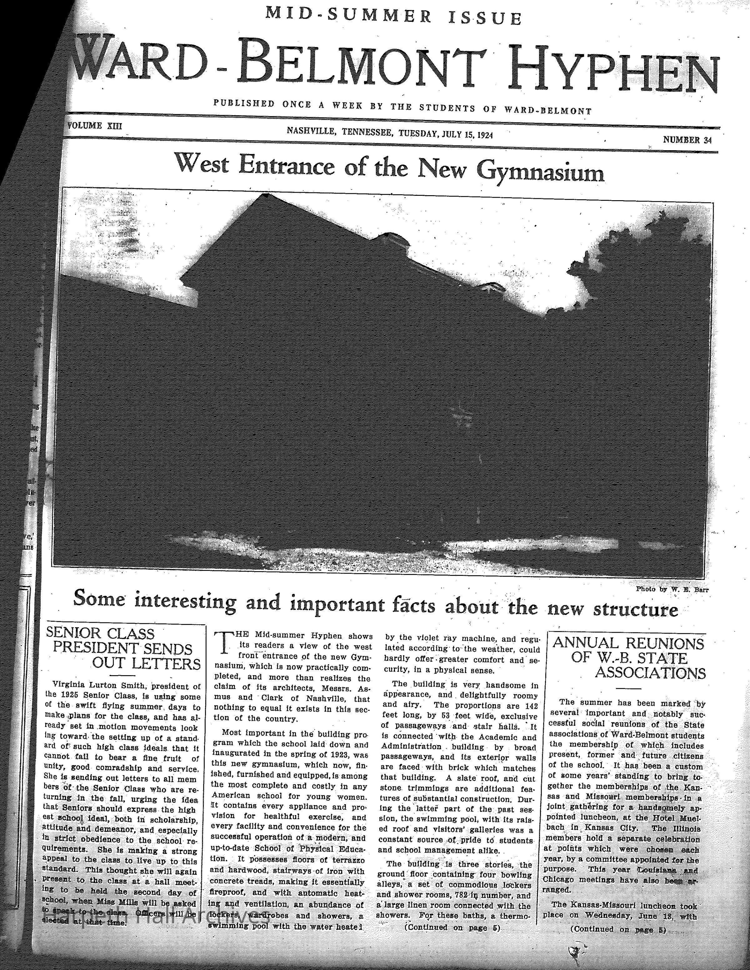 Mis-Summer issue of the Ward Belmont Hyphen. Cover depicts the west entrance of the new gymnasium.