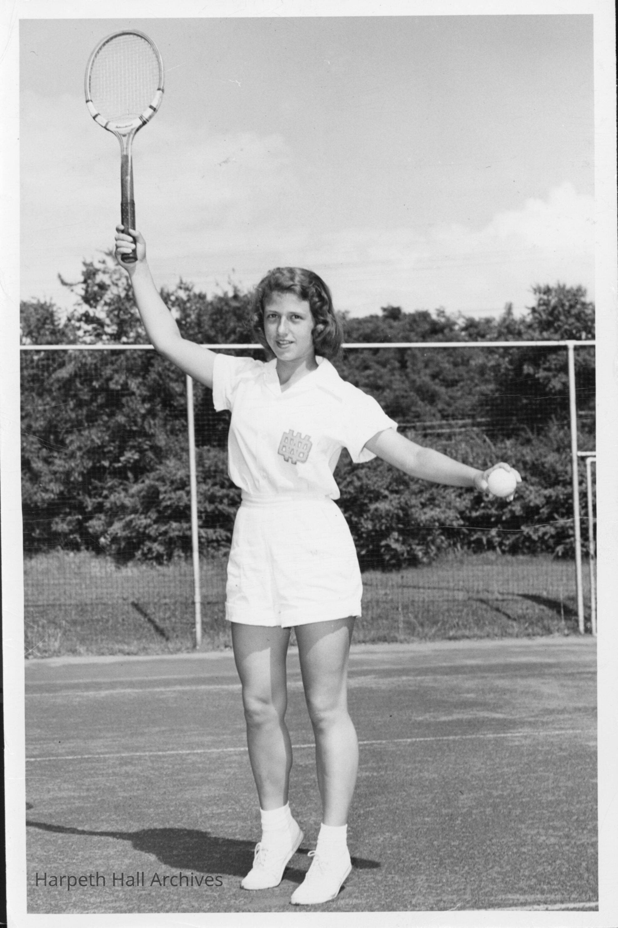 Young woman standing on a tennis court with racket wearing Ward-Belmont tennis uniform. Written on back, "Connie Stevens." Pictured: Cornelia "Connie" Stevens Kelly (1953).