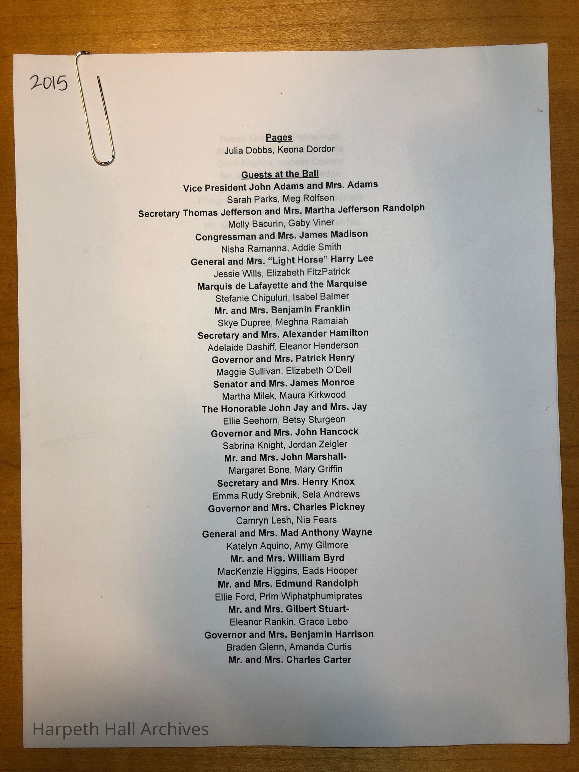 The list of roles for the George Washington Day Celebration in 2015 put on by the class of 2020 when they were in seventh grade.Context