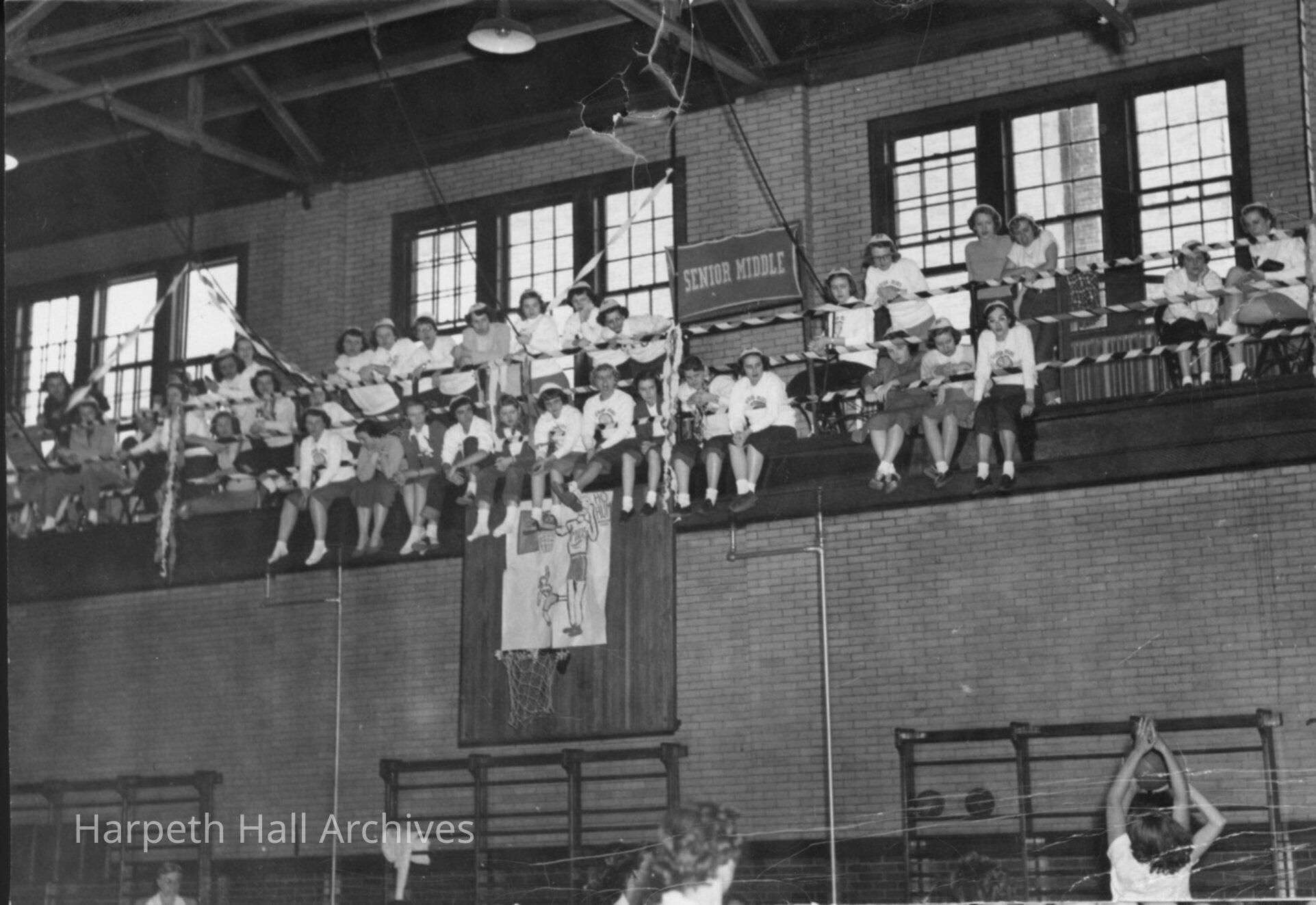 Spectators in gym balcony watching what is probably a basketball game. Young women are wearing beanies and a "Senior Middle" banner hangs on the wall. Penciled on back is "1949-1950". Picture is torn and weakened in back by rubber cement.