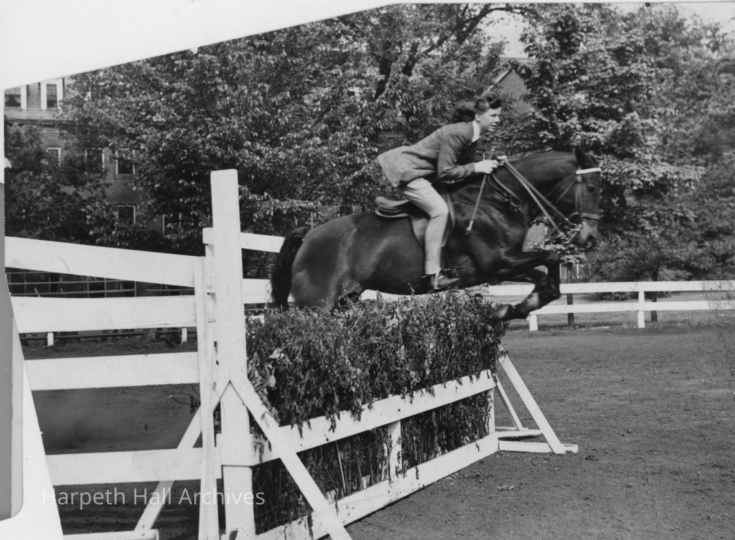 Woman riding horse jumping over fence/hedge. Picture has residue of rubber cement on back and has been trimmed irregularly.