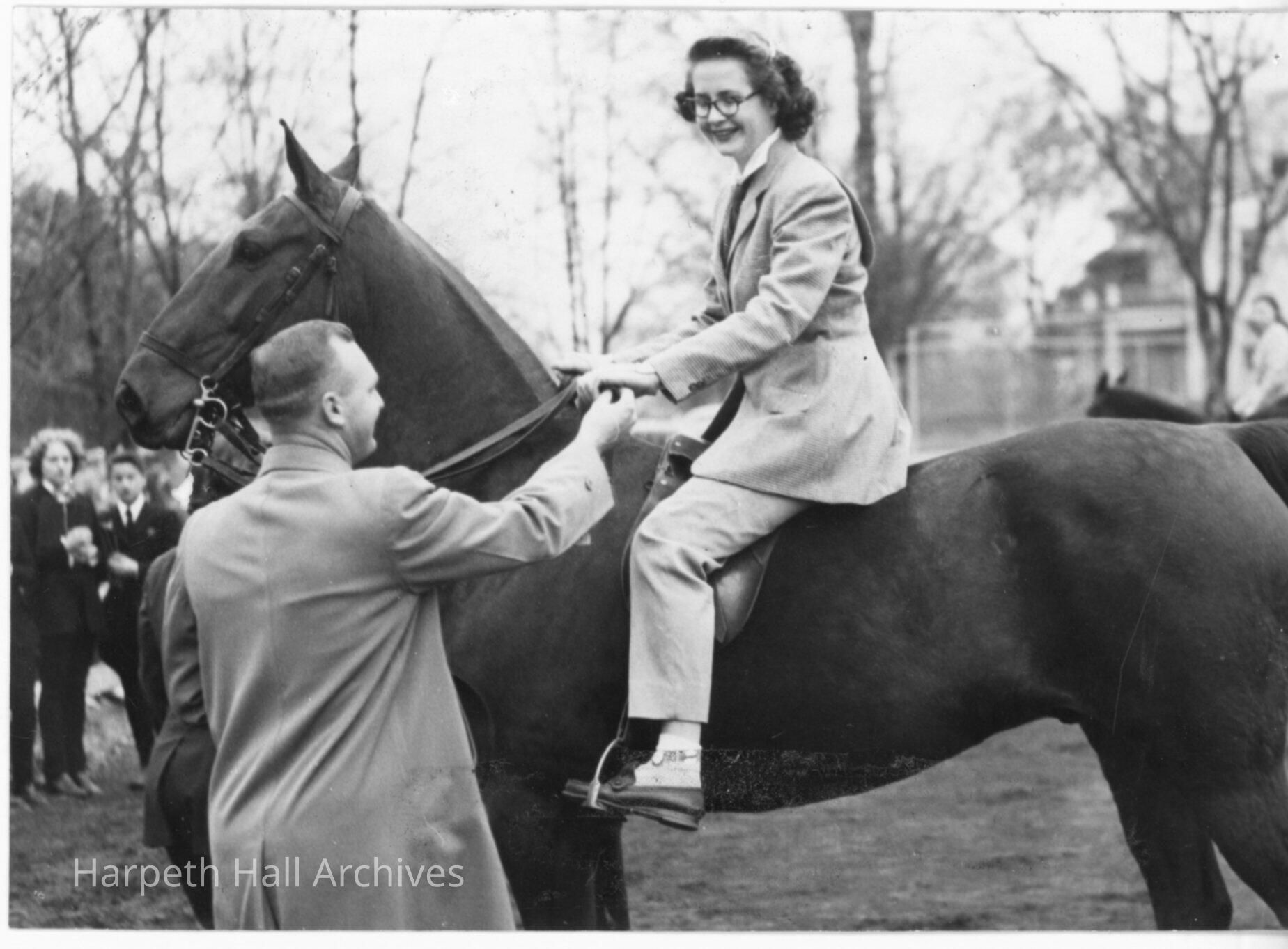 Woman on horse, next to standing man. Picture is damaged from past glue, and slightly torn. Penciled on back is "Milestones p.107".