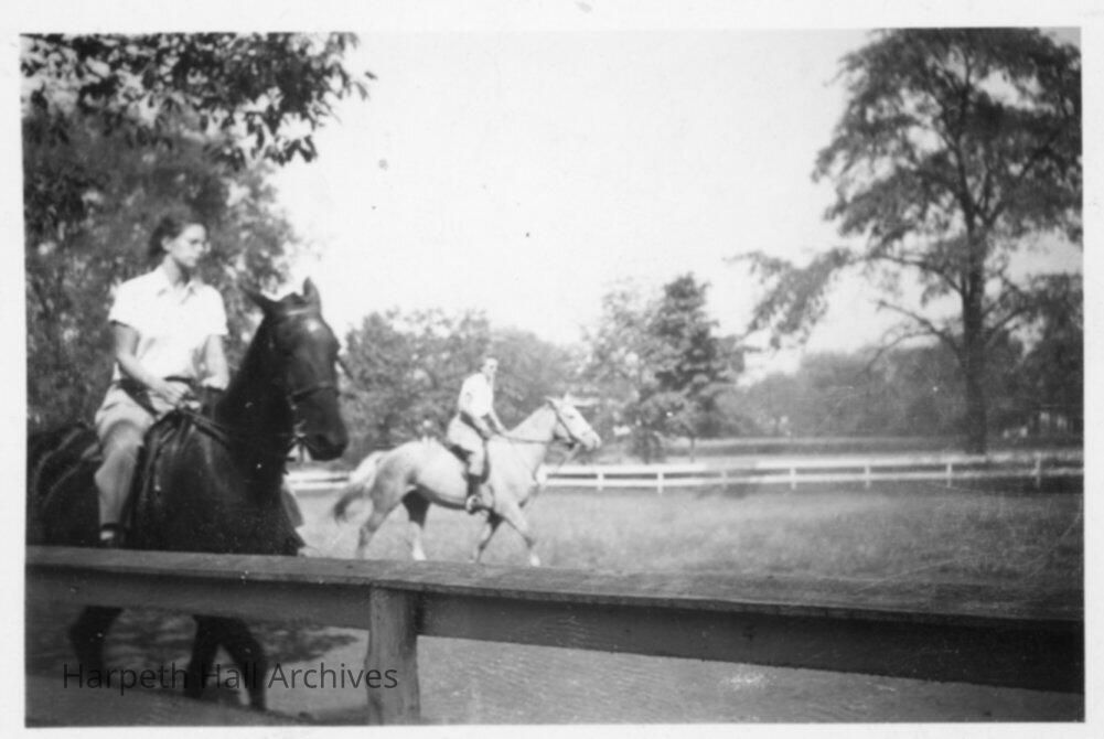 Two women riding horses inside fenced area. Written on back is, "B Marsh".