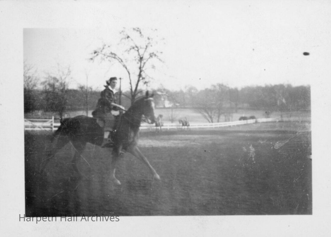 Women in old-fashioned clothing (bloomers?) riding a horse, with other riders visible in distance in fenced area.