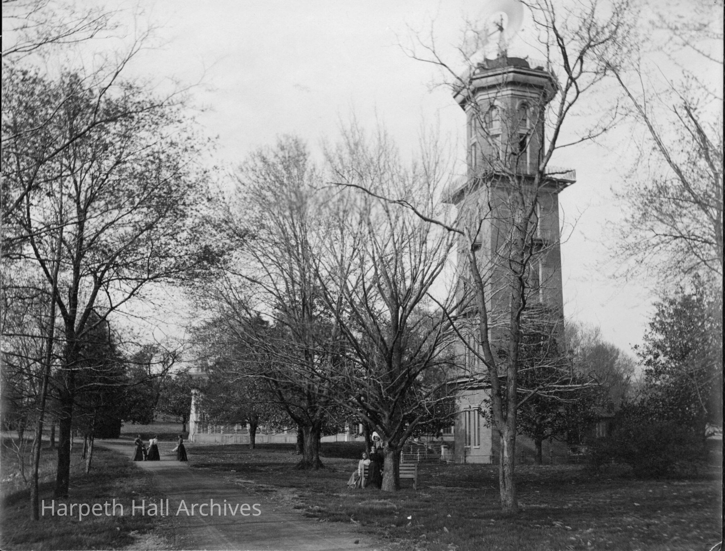 Picture of the water tower and greenhouse with several people visible. Possibly dating back to Belmont College for Young Women.