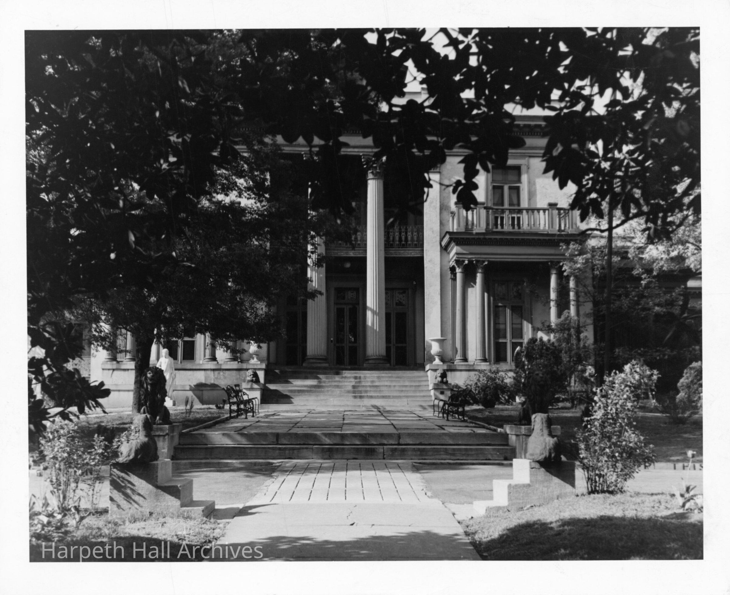 Front steps of Acklen Hall on Ward-Belmont campus. Several benches and planters visible along with a classical statue and four lion statues. Written on back of picture is note, "Ward-Belmont catalog, Polly Fessey." Polly Fessey graduated from Ward Belmont in 1943 and was the Interim Head of School for Harpeth Hall from 1979-1980.