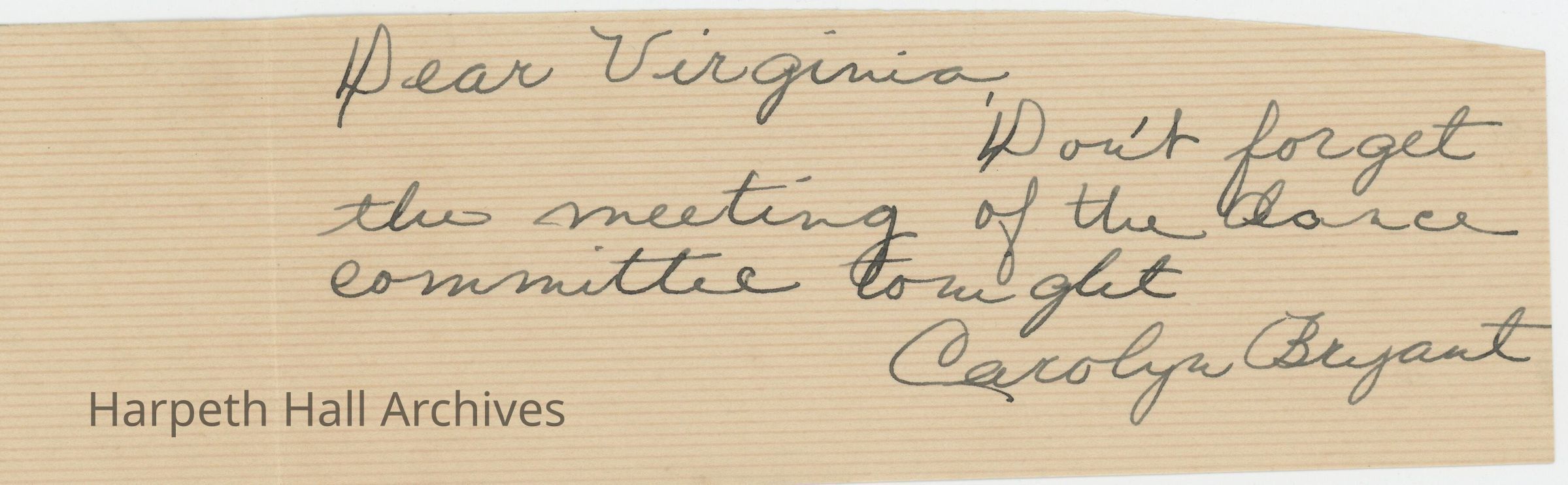 A letter reminding Virginia Richey (1935) of a dance committee meeting from Carolyn Bryant. 'Virginia Richey House-Mail' is written on the frontCollection