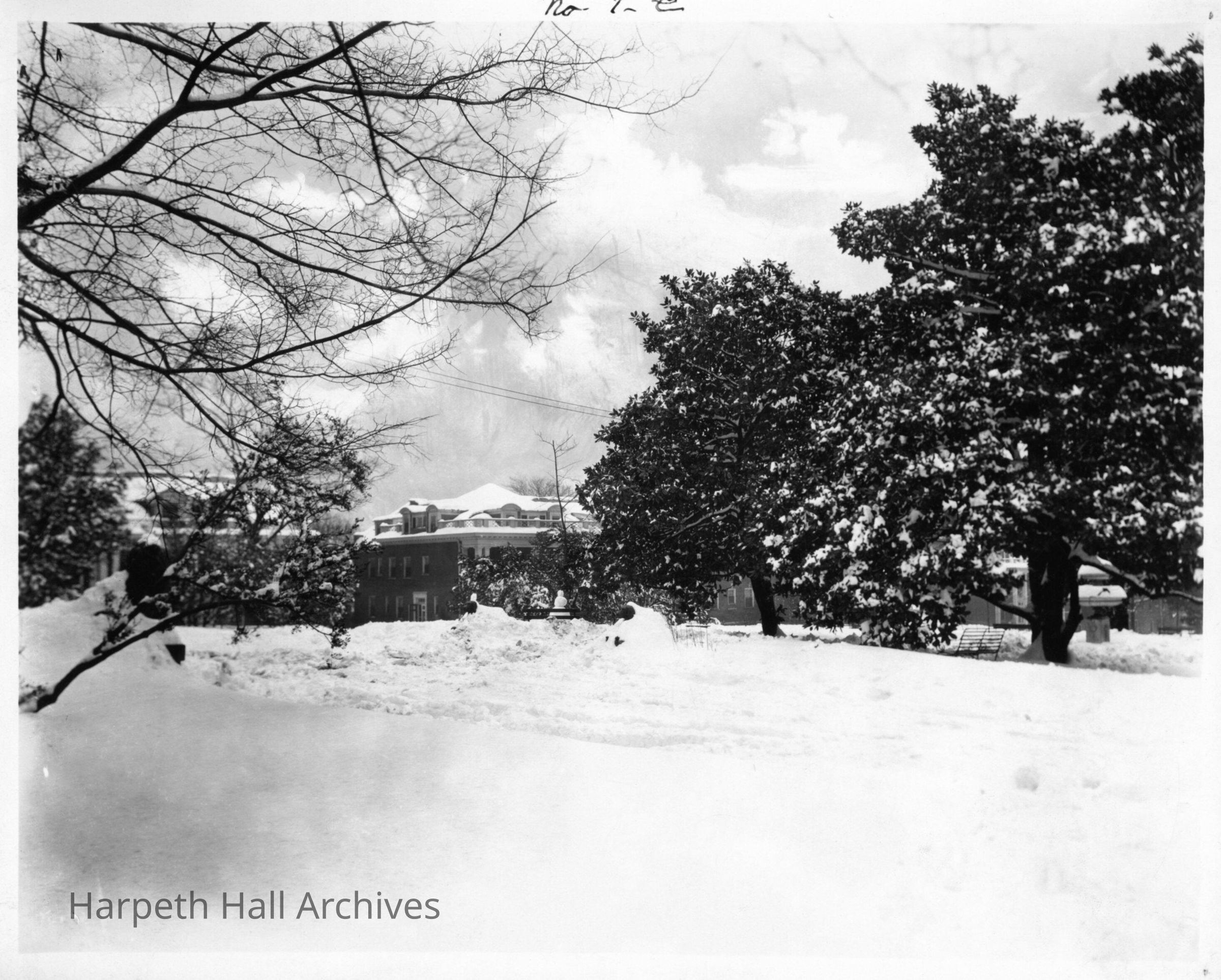 Ward-Belmont campus covered in deep snow. A snowman is visible and several dog statues covered in snow.
