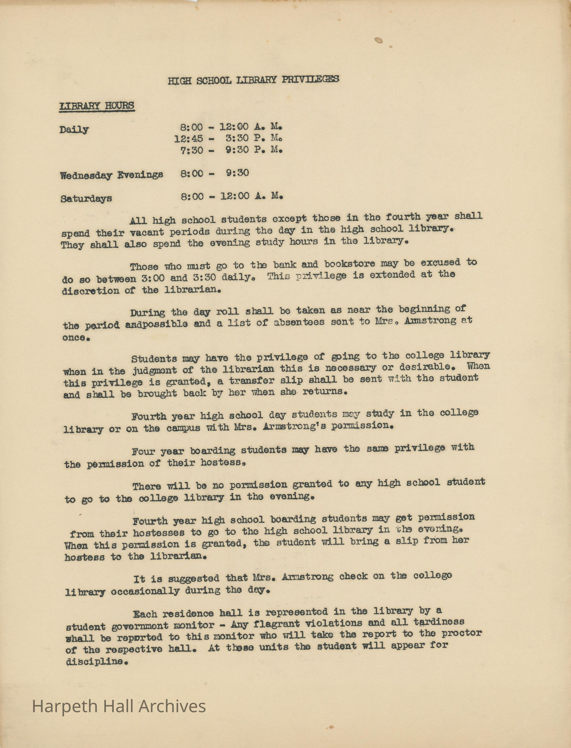 A document discussing library privileges for Ward-Belmont high school students. Notes library hours of operation, instructions for vacant periods/evening study hours, roll call, disciplinary violations, and under what circumstances students are allowed to visit the high school and college libraries based on their year and whether or not they are a boarding student.Collection