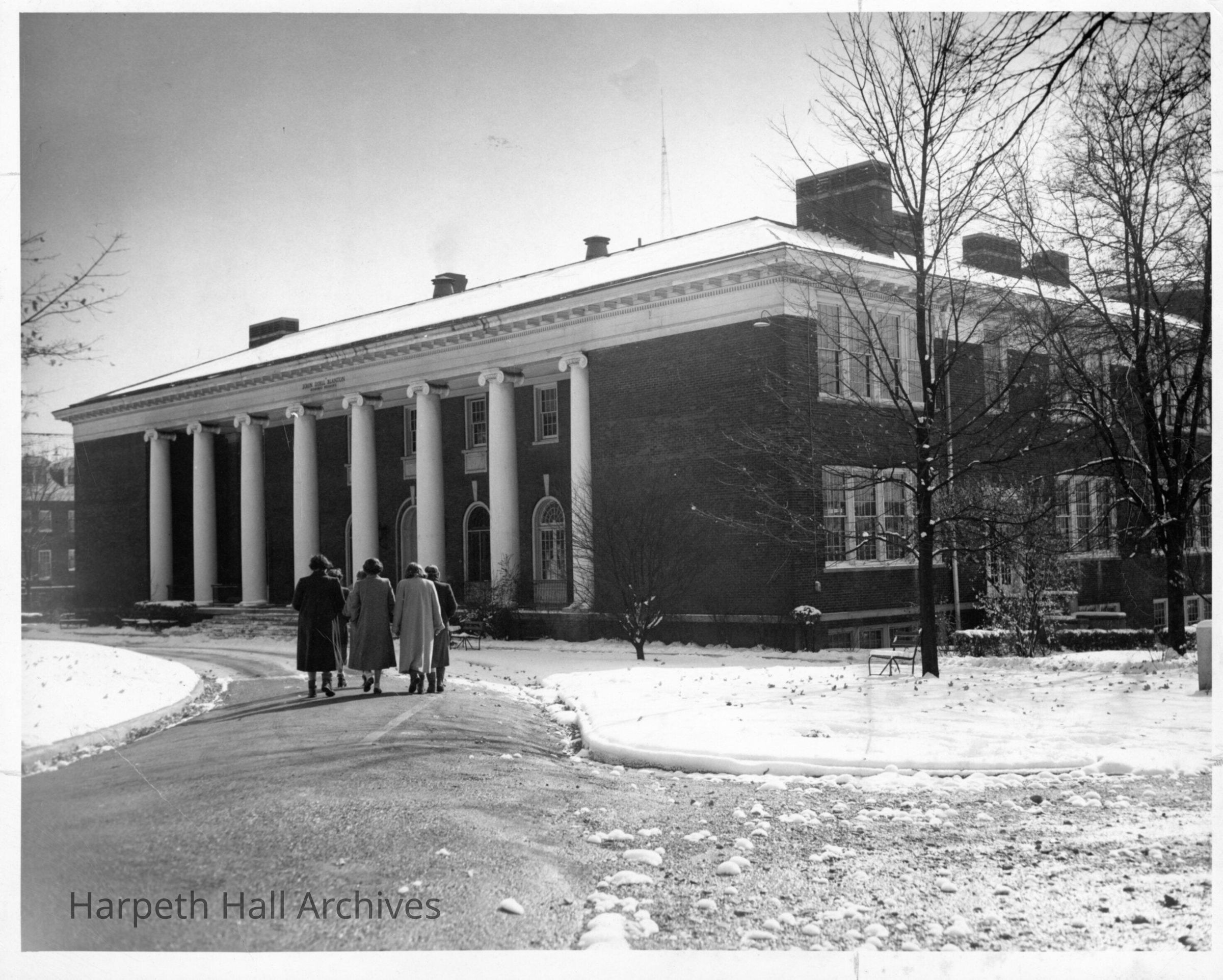 Ward-Belmont building in the snow. Several women in long winter coats walking on driveway.