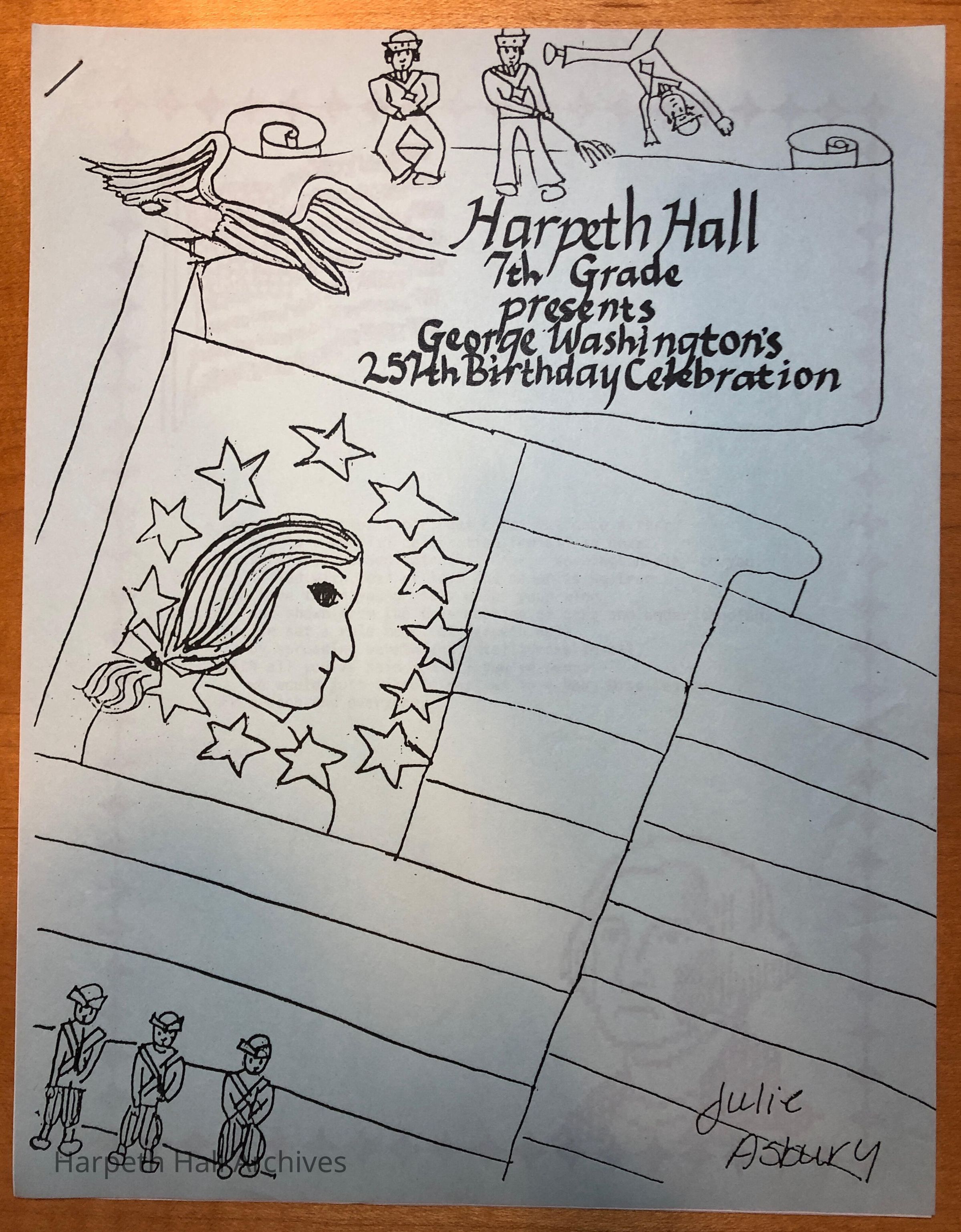 The 1989 program for the George Washington Day Celebration put on by the class of 1994 when they were in the seventh grade. The celebration was dedicated to Polly Fessey. George Washington was played by eighth grader Alexis Reed Sims (1993) and Martha Washington was played by eighth grader Malena Salberg Barzilai (1993). Front cover design by Julie Asbury Gordon (1994).Context