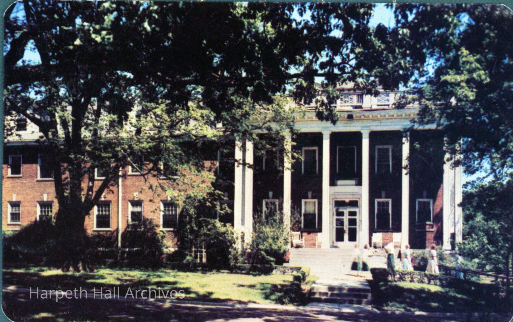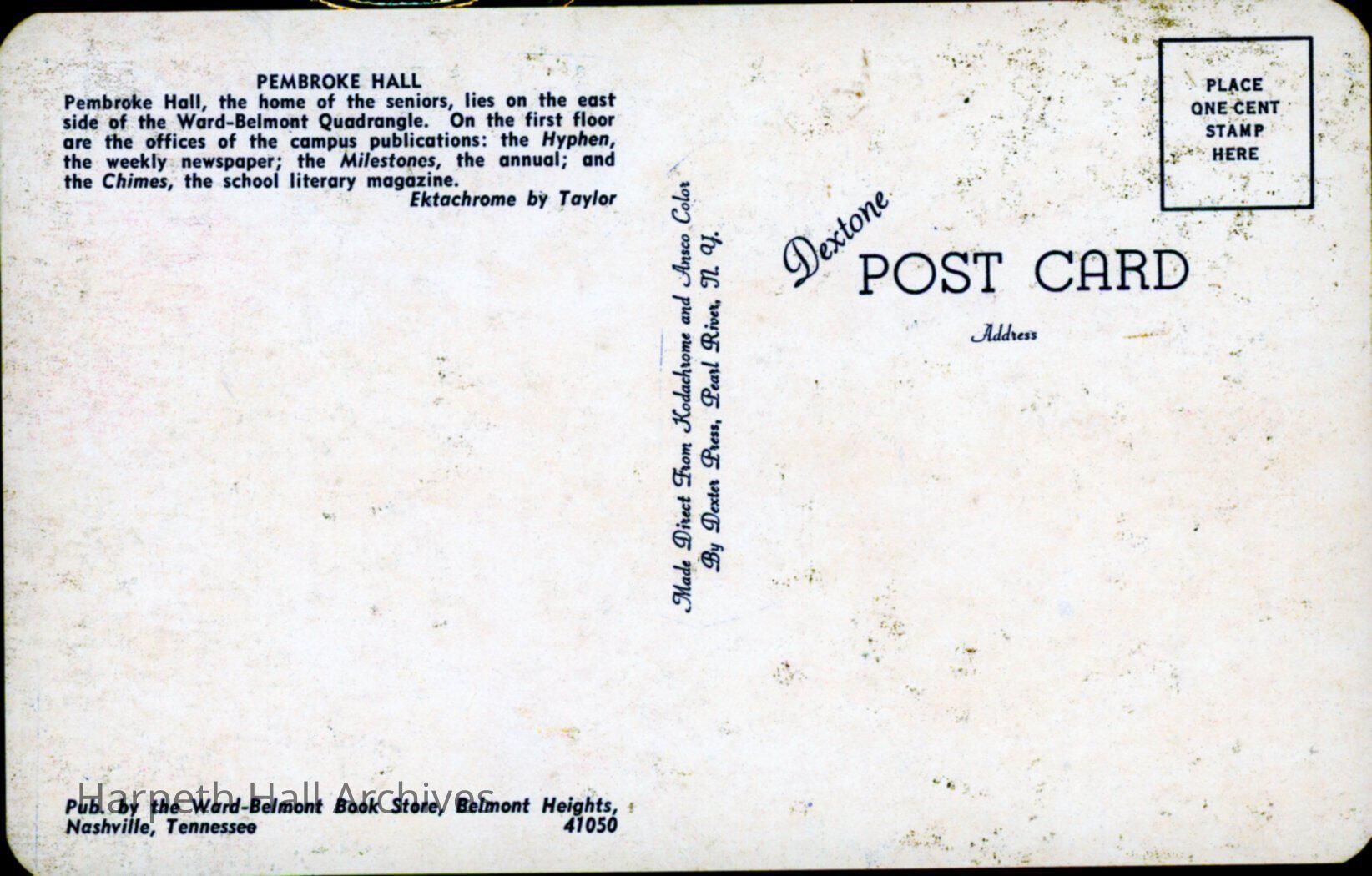 Post card published by the Ward-Belmont Book Store. Text reads, "PEMBROKE HALL - Pembroke Hall, the home of the seniors, lies on the east side of the Ward-Belmont Quadrangle. On the first floor are the offices of the campus publications: the Hyphen, the weekly newspaper; the Milestones, the annual; and the Chimes, the school literary magazine." Ektachrome by Taylor. Dextone, made direct from Kodachrome and Ansco Color. 2 copies.Collection