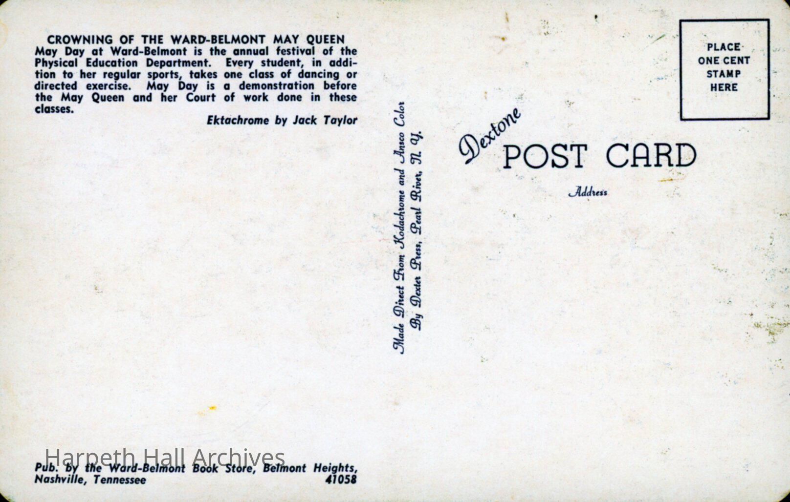 Post card published by the Ward-Belmont Book Store. Text reads, "CROWNING OF THE WARD-BELMONT MAY QUEEN - May Day at Ward-Belmont is the annual festival of the Physical Education Department. Every student, in addition to her regular sports, takes one class of dancing or directed exercise. May Day is a demonstration before the May Queen and her Court of work done in these classes." Ektachrome by Taylor. Dextone, made direct from Kodachrome and Ansco Color. 4 copies.Collection