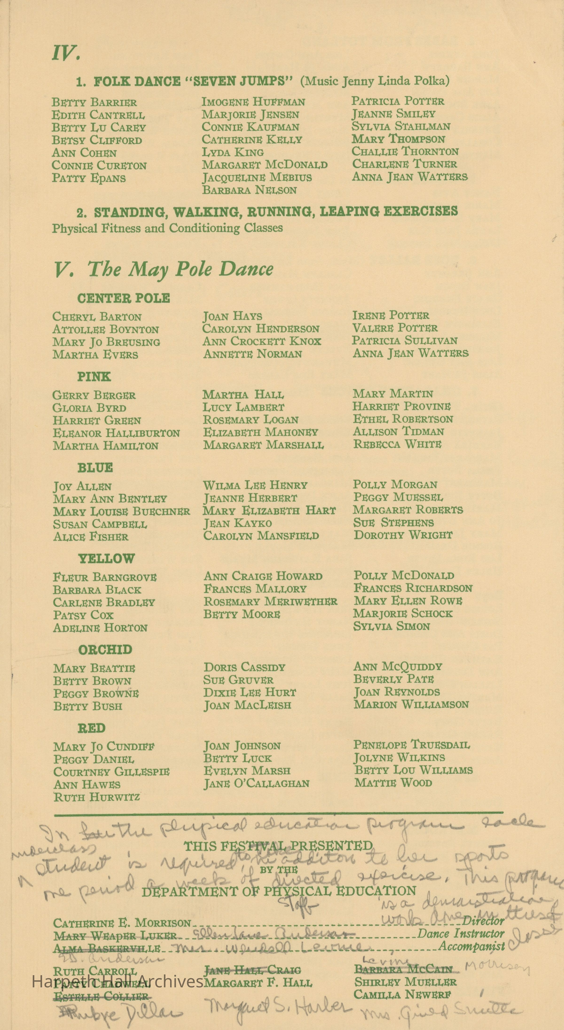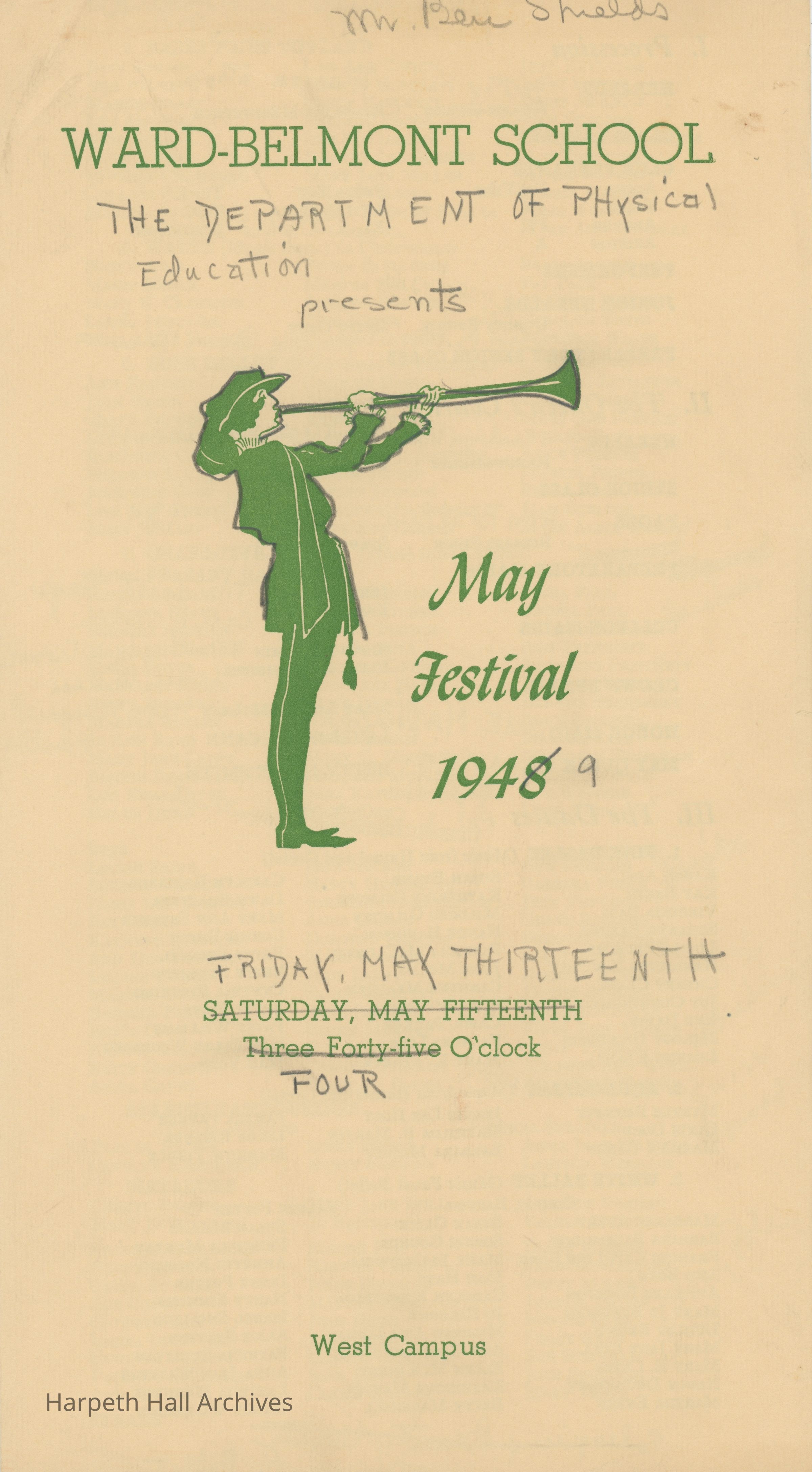 A program for the 1948 Ward-Belmont May Festival, presented by the Department of Physical Education. Held on the West Campus on Saturday, May 15, 1948, at 3:45 P.M. The program consisted of five parts: a procession, the presentation of the May Queen and her court, seven dance performances ("The Dances"), a folk dance and a demonstration of exercises (standing, walking, running, and leaping) by the physical fitness and conditioning classes, and the May Pole dance. The 1948 May Queen was Betty Irene Smith.